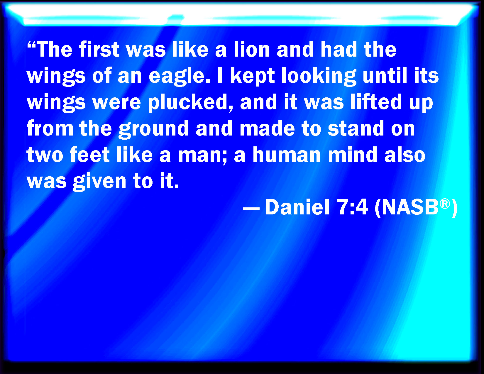 Bible Verse Slide Daniel 7:4 The first was like a lion, and had eagle's wings: I beheld till the wings thereof were plucked, and it was lifted up from the earth, and made stand on the feet as a man, and a man's heart was given to it. KJV: The first was like a lion, and had eagle's wings: I beheld till the wings thereof were plucked, and it was lifted up from the earth, and made stand upon the feet as a man, and a man's heart was given to it. DRB: The first was like a lioness, and had the wings of an eagle: I beheld till her wings were plucked off, and she was lifted up from the earth, and stood upon her feet as a man, and the heart of a man was given to her. DBT: The first was like a lion, and had eagle's wings: I beheld till its wings were plucked; and it was lifted up from the earth, and made to stand upon two feet as a man, and a man's heart was given to it. ERV: The first was like a lion, and had eagle's wings: I beheld till the wings thereof were plucked, and it was lifted up from the earth, and made to stand upon two feet as a man, and a man's heart was given to it. WBT: The first was like a lion, and had eagles' wings: I beheld till its wings were plucked, and it was lifted up from the earth, and made to stand upon the feet as a man, and a man's heart was given to it. WEB: The first was like a lion, and had eagle's wings: I saw until its wings were plucked, and it was lifted up from the earth, and made to stand on two feet as a man; and a man's heart was given to it. YLT: The first is like a lion, and it hath an eagle's wings. I was seeing till that its wings have been plucked, and it hath been lifted up from the earth, and on feet as a man it hath been caused to stand, and a heart of man is given to it.Links Daniel 7:4 NIV • Daniel 7:4 NLT • Daniel 7:4 ESV • Daniel 7:4 NASB • Daniel 7:4 KJV • Daniel 7:4 Interlinear • Daniel 7:4 Commentaries • Daniel 7:4 Parallel Texts • Daniel 7:4 Bible Apps • Daniel 7:4 Parallel • Bible Hub |