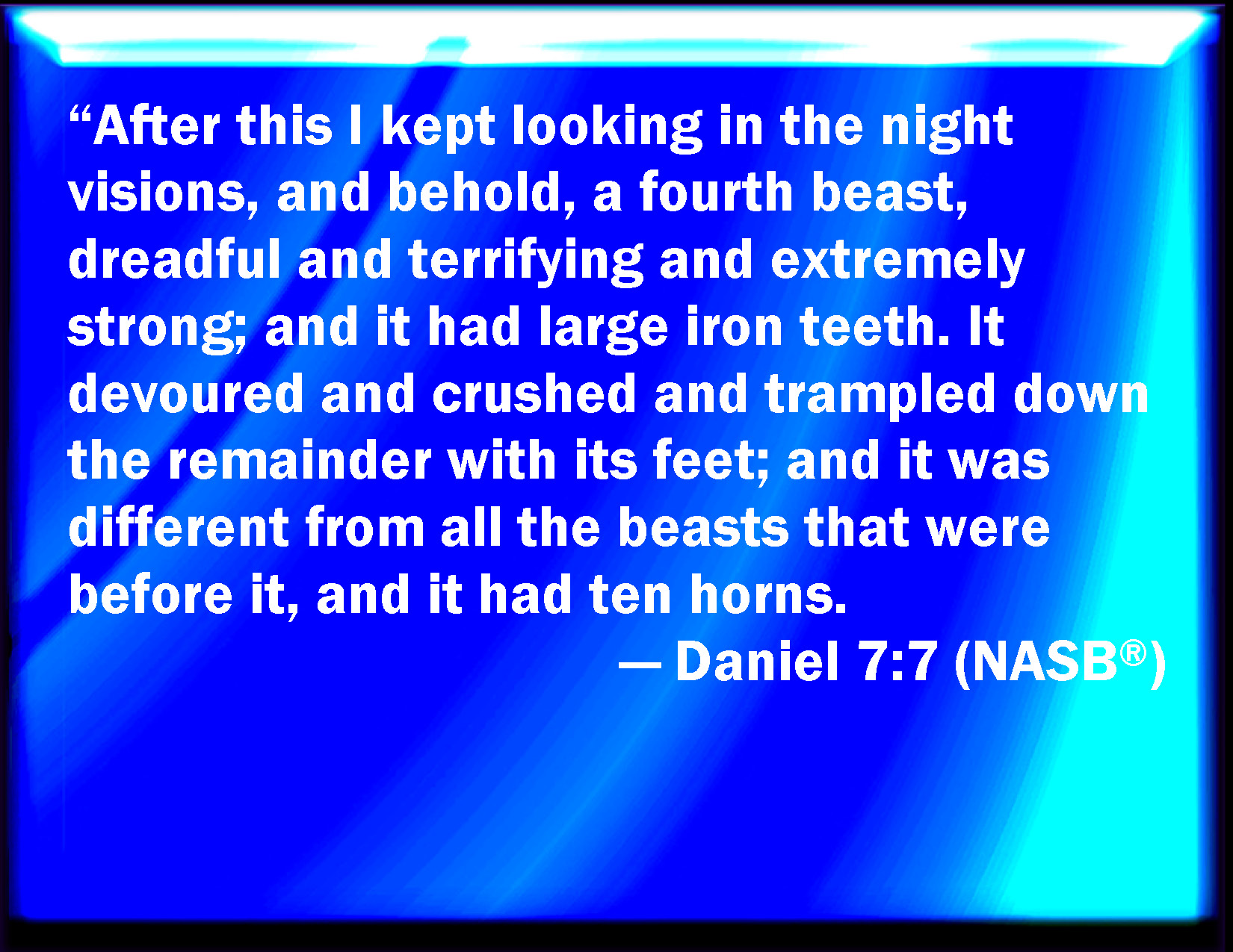 Bible Verse Slide Daniel 7:7 After this I saw in the night visions, and behold a fourth beast, dreadful and terrible, and strong exceedingly; and it had great iron teeth: it devoured and broke in pieces, and stamped the residue with the feet of it: and it was diverse from all the beasts that were before it; and it had ten horns. KJV: After this I saw in the night visions, and behold a fourth beast, dreadful and terrible, and strong exceedingly; and it had great iron teeth: it devoured and brake in pieces, and stamped the residue with the feet of it: and it was diverse from all the beasts that were before it; and it had ten horns. DRB: After this I beheld in the vision of the night, and lo, a fourth beast, terrible and wonderful, and exceeding strong, it had great iron teeth, eating and breaking in pieces, and treading down the rest with its feet: and it was unlike to the other beasts which I had seen before it, and had ten horns. DBT: After this I saw in the night visions, and behold, a fourth beast, dreadful and terrible, and exceeding strong; and it had great iron teeth: it devoured and broke in pieces, and stamped the rest with its feet; and it was different from all the beasts that were before it; and it had ten horns. ERV: After this I saw in the night visions, and behold a fourth beast, terrible and powerful, and strong exceedingly; and it had great iron teeth: it devoured and brake in pieces, and stamped the residue with his feet: and it was diverse from all the beasts that were before it; and it had ten horns. WBT: After this I saw in the night visions, and behold a fourth beast, dreadful and terrible, and strong exceedingly; and it had great iron teeth: it devoured and broke in pieces, and stamped the residue with its feet: and it was diverse from all the beasts that were before it; and it had ten horns. WEB: After this I saw in the night visions, and, behold, a fourth animal, awesome and powerful, and strong exceedingly; and it had great iron teeth; it devoured and broke in pieces, and stamped the residue with its feet: and it was diverse from all the animals that were before it; and it had ten horns. YLT: After this I was seeing in the visions of the night, and lo, a fourth beast, terrible and fearful, and exceedingly strong; and it hath iron teeth very great, it hath consumed, yea, it doth break small, and the remnant with its feet it hath trampled; and it is diverse from all the beasts that are before it; and it hath ten horns.Links Daniel 7:7 NIV • Daniel 7:7 NLT • Daniel 7:7 ESV • Daniel 7:7 NASB • Daniel 7:7 KJV • Daniel 7:7 Interlinear • Daniel 7:7 Commentaries • Daniel 7:7 Parallel Texts • Daniel 7:7 Bible Apps • Daniel 7:7 Parallel • Bible Hub |