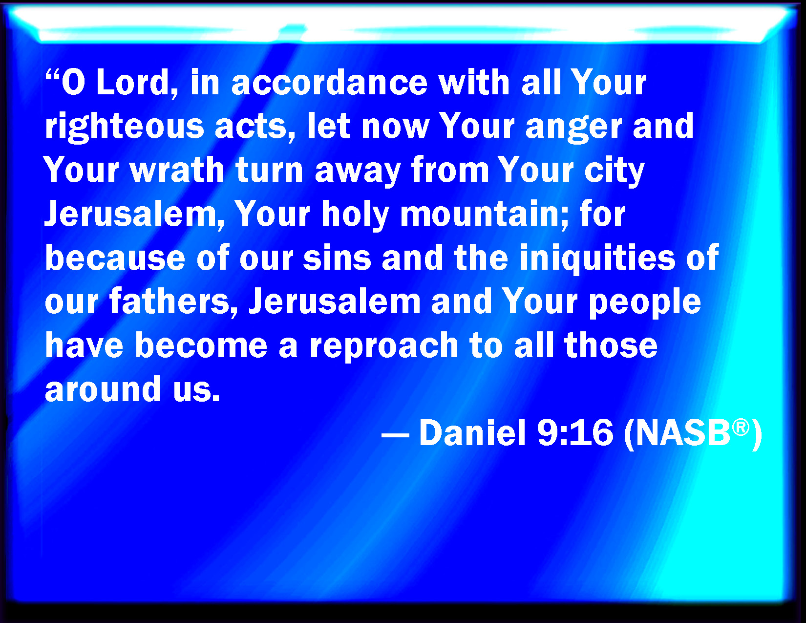 Bible Verse Slide Daniel 9:16 O LORD, according to all your righteousness, I beseech you, let your anger and your fury be turned away from your city Jerusalem, your holy mountain: because for our sins, and for the iniquities of our fathers, Jerusalem and your people are become a reproach to all that are about us. KJV: O Lord, according to all thy righteousness, I beseech thee, let thine anger and thy fury be turned away from thy city Jerusalem, thy holy mountain: because for our sins, and for the iniquities of our fathers, Jerusalem and thy people are become a reproach to all that are about us. DRB: O Lord, against all thy justice: let thy wrath and thy indignation be turned away, I beseech thee, from thy city Jerusalem, and from thy holy mountain. For by reason of our sins, and the iniquities of our fathers, Jerusalem, and thy people are a reproach to all that are round about us. DBT: Lord, according to all thy righteousnesses, I beseech thee, let thine anger and thy fury be turned away from thy city Jerusalem, thy holy mountain; for because of our sins, and because of the iniquities of our fathers, Jerusalem and thy people are become a reproach to all round about us. ERV: O Lord, according to all thy righteousness, let thine anger and thy fury, I pray thee, be turned away from thy city Jerusalem, thy holy mountain: because for our sins, and for the iniquities of our fathers, Jerusalem and thy people are become a reproach to all that are round about us. WBT: O Lord, according to all thy righteousness, I beseech thee, let thy anger and thy fury be turned away from thy city Jerusalem, thy holy mountain: because for our sins and for the iniquities of our fathers, Jerusalem and thy people have become a reproach to all that are about us. WEB: Lord, according to all your righteousness, let your anger and please let your wrath be turned away from your city Jerusalem, your holy mountain; because for our sins, and for the iniquities of our fathers, Jerusalem and your people have become a reproach to all who are around us. YLT: O Lord, according to all Thy righteous acts, let turn back, I pray Thee, Thine anger and Thy fury from Thy city Jerusalem, Thy holy mount, for by our sins, and by the iniquities of our fathers, Jerusalem and Thy people are for a reproach to all our neighbours;Links Daniel 9:16 NIV • Daniel 9:16 NLT • Daniel 9:16 ESV • Daniel 9:16 NASB • Daniel 9:16 KJV • Daniel 9:16 Interlinear • Daniel 9:16 Commentaries • Daniel 9:16 Parallel Texts • Daniel 9:16 Bible Apps • Daniel 9:16 Parallel • Bible Hub |