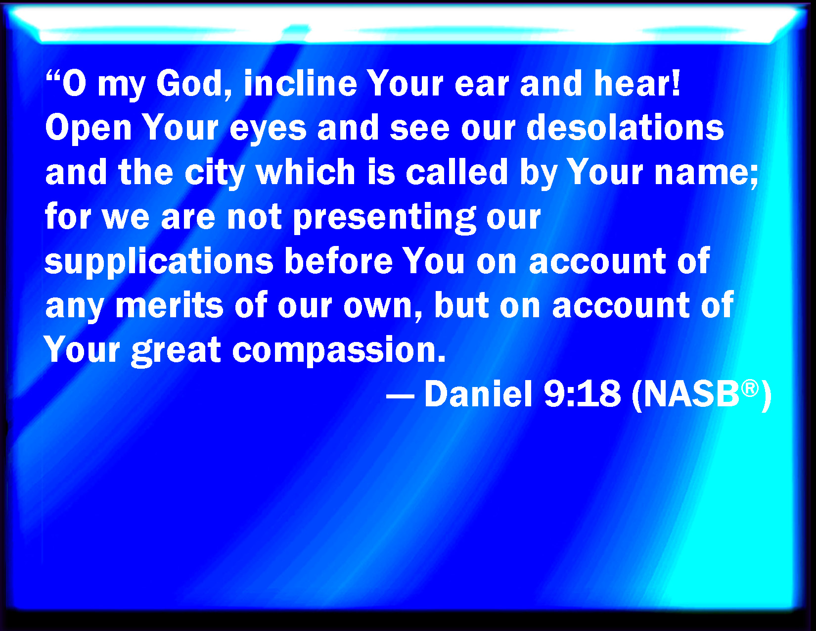 Bible Verse Slide Daniel 9:18 O my God, incline your ear, and hear; open your eyes, and behold our desolations, and the city which is called by your name: for we do not present our supplications before you for our righteousnesses, but for your great mercies. KJV: O my God, incline thine ear, and hear; open thine eyes, and behold our desolations, and the city which is called by thy name: for we do not present our supplications before thee for our righteousnesses, but for thy great mercies. DRB: Incline, O my God, thy ear, and hear: open thy eyes, and see our desolation, and the city upon which thy name is called: for it is not for our justifications that we present our prayers before thy face, but for the multitude of thy tender mercies. DBT: Incline thine ear, O my God, and hear; open thine eyes and behold our desolations, and the city that is called by thy name: for we do not present our supplications before thee because of our righteousnesses, but because of thy manifold mercies. ERV: O my God, incline thine ear, and hear; open thine eyes, and behold our desolations, and the city which is called by thy name: for we do not present our supplications before thee for our righteousnesses, but for thy great mercies. WBT: O my God, incline thy ear, and hear; open thy eyes, and behold our desolations, and the city which is called by thy name: for we do not present our supplications before thee for our righteousnesses, but for thy great mercies. WEB: My God, turn your ear, and hear; open your eyes, and see our desolations, and the city which is called by your name: for we do not present our petitions before you for our righteousness, but for your great mercies' sake. YLT: Incline, O my God, Thine ear, and hear, open Thine eyes and see our desolations, and the city on which Thy name is called; for not for our righteous acts are we causing our supplications to fall before Thee, but for Thy mercies that are many.Links Daniel 9:18 NIV • Daniel 9:18 NLT • Daniel 9:18 ESV • Daniel 9:18 NASB • Daniel 9:18 KJV • Daniel 9:18 Interlinear • Daniel 9:18 Commentaries • Daniel 9:18 Parallel Texts • Daniel 9:18 Bible Apps • Daniel 9:18 Parallel • Bible Hub |