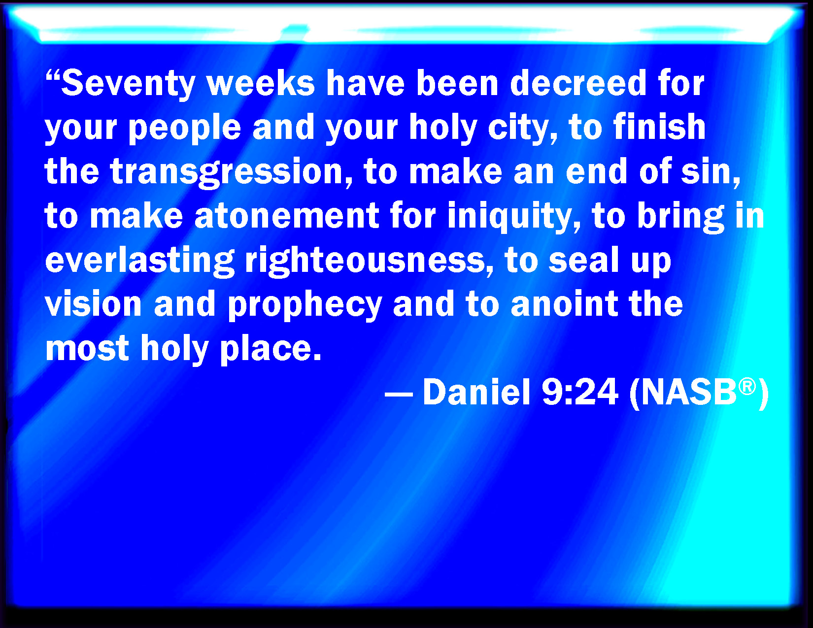 Bible Verse Slide Daniel 9:24 Seventy weeks are determined on your people and on your holy city, to finish the transgression, and to make an end of sins, and to make reconciliation for iniquity, and to bring in everlasting righteousness, and to seal up the vision and prophecy, and to anoint the most Holy. KJV: Seventy weeks are determined upon thy people and upon thy holy city, to finish the transgression, and to make an end of sins, and to make reconciliation for iniquity, and to bring in everlasting righteousness, and to seal up the vision and prophecy, and to anoint the most Holy. DRB: Seventy weeks are shortened upon thy people, and upon thy holy city, that transgression may be finished, and sin may have an end, and iniquity may be abolished; and everlasting justice may be brought; and vision and prophecy may be fulfilled; and the saint of saints may be anointed. DBT: Seventy weeks are apportioned out upon thy people and upon thy holy city, to close the transgression, and to make an end of sins, and to make expiation for iniquity, and to bring in the righteousness of the ages, and to seal the vision and prophet, and to anoint the holy of holies. ERV: Seventy weeks are decreed upon thy people and upon thy holy city, to finish transgression, and to make an end of sins, and to make reconciliation for iniquity, and to bring in everlasting righteousness, and to seal up vision and prophecy, and to anoint the most holy. WBT: Seventy weeks are determined upon thy people and upon thy holy city to finish the transgression, and to make an end of sins, and to make reconciliation for iniquity, and to bring in everlasting righteousness, and to seal up the vision and prophecy, and to anoint the most Holy. WEB: Seventy weeks are decreed on your people and on your holy city, to finish disobedience, and to make an end of sins, and to make reconciliation for iniquity, and to bring in everlasting righteousness, and to seal up vision and prophecy, and to anoint the most holy. YLT: 'Seventy weeks are determined for thy people, and for thy holy city, to shut up the transgression, and to seal up sins, and to cover iniquity, and to bring in righteousness age-during, and to seal up vision and prophet, and to anoint the holy of holies.Links Daniel 9:24 NIV • Daniel 9:24 NLT • Daniel 9:24 ESV • Daniel 9:24 NASB • Daniel 9:24 KJV • Daniel 9:24 Interlinear • Daniel 9:24 Commentaries • Daniel 9:24 Parallel Texts • Daniel 9:24 Bible Apps • Daniel 9:24 Parallel • Bible Hub |