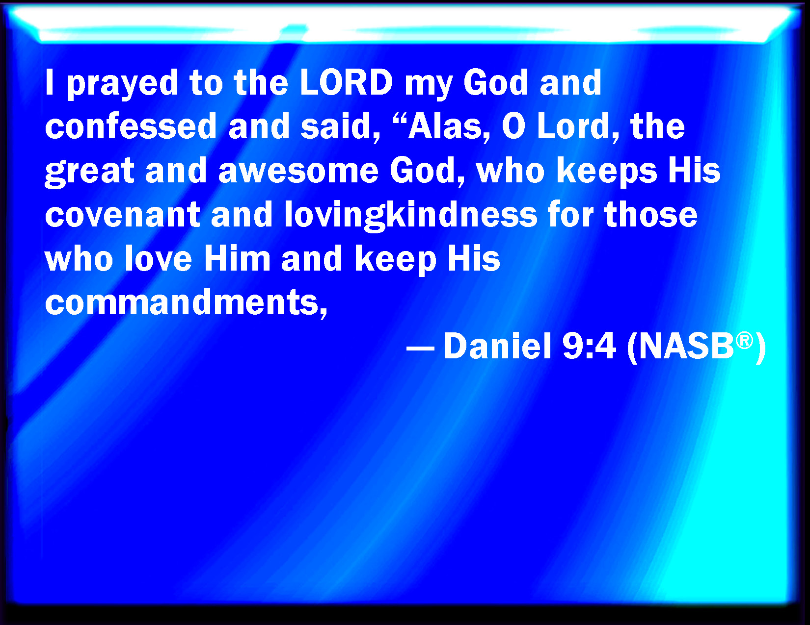Bible Verse Slide Daniel 9:4 And I prayed to the LORD my God, and made my confession, and said, O Lord, the great and dreadful God, keeping the covenant and mercy to them that love him, and to them that keep his commandments; KJV: And I prayed unto the LORD my God, and made my confession, and said, O Lord, the great and dreadful God, keeping the covenant and mercy to them that love him, and to them that keep his commandments; DRB: And I prayed to the Lord my God, and I made my confession, and said: I beseech thee, O Lord God, great and terrible, who keepest the covenant, and mercy to them that love thee, and keep thy commandments. DBT: and I prayed unto Jehovah my God, and made my confession, and said, Alas Lord! the great and terrible God, keeping covenant and loving-kindness with them that love him, and that keep his commandments: ERV: And I prayed unto the LORD my God, and made confession, and said, O Lord, the great and dreadful God, which keepeth covenant and mercy with them that love him and keep his commandments; WBT: And I prayed to the LORD my God, and made my confession, and said, O Lord, the great and dreadful God, keeping the covenant and mercy to them that love him, and to them that keep his commandments; WEB: I prayed to Yahweh my God, and made confession, and said, Oh, Lord, the great and dreadful God, who keeps covenant and loving kindness with those who love him and keep his commandments, YLT: And I pray to Jehovah my God, and confess, and say: 'I beseech Thee, O Lord God, the great and the fearful, keeping the covenant and the kindness to those loving Him, and to those keeping His commands;Links Daniel 9:4 NIV • Daniel 9:4 NLT • Daniel 9:4 ESV • Daniel 9:4 NASB • Daniel 9:4 KJV • Daniel 9:4 Interlinear • Daniel 9:4 Commentaries • Daniel 9:4 Parallel Texts • Daniel 9:4 Bible Apps • Daniel 9:4 Parallel • Bible Hub |