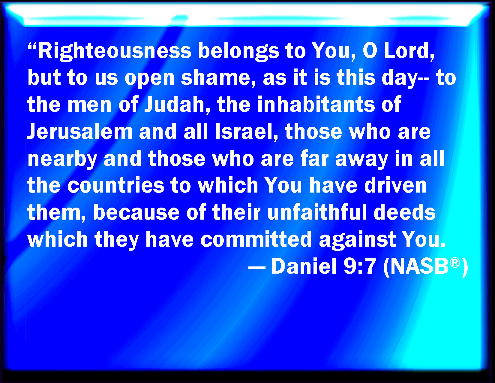 Bible Verse Slide Daniel 9:7 O LORD, righteousness belongs to you, but to us confusion of faces, as at this day; to the men of Judah, and to the inhabitants of Jerusalem, and to all Israel, that are near, and that are far off, through all the countries where you have driven them, because of their trespass that they have trespassed against you. KJV: O Lord, righteousness belongeth unto thee, but unto us confusion of faces, as at this day; to the men of Judah, and to the inhabitants of Jerusalem, and unto all Israel, that are near, and that are far off, through all the countries whither thou hast driven them, because of their trespass that they have trespassed against thee. DRB: To thee, O Lord, justice: but to us confusion of face, as at this day to the men of Juda, and to the inhabitants of Jerusalem, and to all Israel to them that are near, and to them that are far off in all the countries whither thou hast driven them, for their iniquities by which they have sinned against thee. DBT: Thine, O Lord, is the righteousness, but unto us confusion of face, as at this day, to the men of Judah, and to the inhabitants of Jerusalem, and unto all Israel, that are near, and that are far off, in all the countries whither thou hast driven them, because of their unfaithfulness in which they have been unfaithful against thee. ERV: O Lord, righteousness belongeth unto thee, but unto us confusion of face, as at this day; to the men of Judah, and to the inhabitants of Jerusalem, and unto all Israel, that are near, and that are far off, through all the countries whither thou hast driven them, because of their trespass that they have trespassed against thee. WBT: O Lord, righteousness belongeth to thee, but to us confusion of faces, as at this day; to the men of Judah, and to the inhabitants of Jerusalem, and to all Israel, that are near, and that are far off, through all the countries whither thou hast driven them, because of their trespass that they have trespassed against thee. WEB: Lord, righteousness belongs to you, but to us confusion of face, as at this day; to the men of Judah, and to the inhabitants of Jerusalem, and to all Israel, who are near, and who are far off, through all the countries where you have driven them, because of their trespass that they have trespassed against you. YLT: To Thee, O Lord, is the righteousness, and to us the shame of face, as at this day, to the men of Judah, and to the inhabitants of Jerusalem, and to all Israel, who are near, and who are far off, in all the lands whither Thou hast driven them, in their trespass that they have trespassed against Thee.Links Daniel 9:7 NIV • Daniel 9:7 NLT • Daniel 9:7 ESV • Daniel 9:7 NASB • Daniel 9:7 KJV • Daniel 9:7 Interlinear • Daniel 9:7 Commentaries • Daniel 9:7 Parallel Texts • Daniel 9:7 Bible Apps • Daniel 9:7 Parallel • Bible Hub |