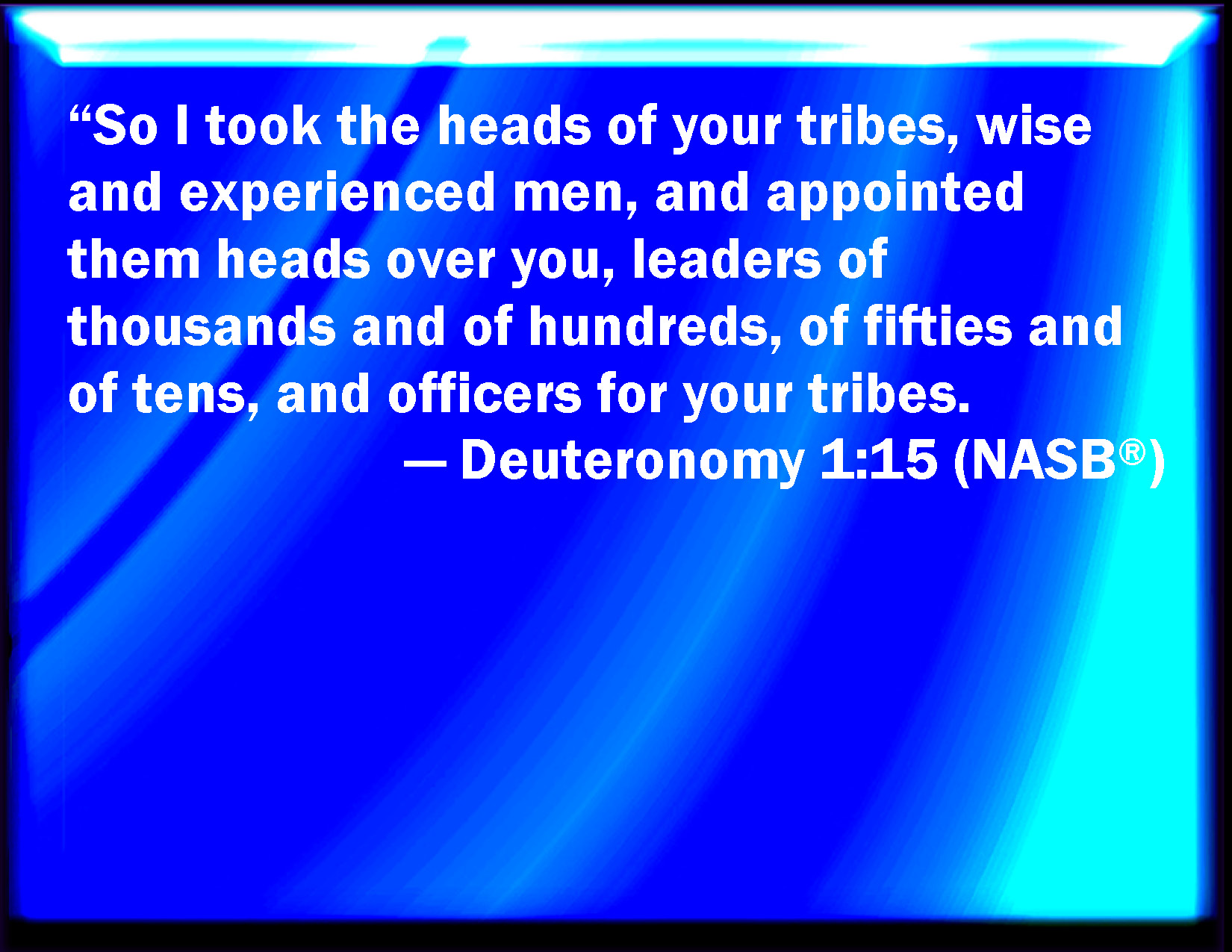 Bible Verse Slide Deuteronomy 1:15 So I took the chief of your tribes, wise men, and known, and made them heads over you, captains over thousands, and captains over hundreds, and captains over fifties, and captains over tens, and officers among your tribes. KJV: So I took the chief of your tribes, wise men, and known, and made them heads over you, captains over thousands, and captains over hundreds, and captains over fifties, and captains over tens, and officers among your tribes. DRB: And I took out of your tribes men wise and honourable, and appointed them rulers, tribunes, and centurions, and officers over fifties, and over tens, who might teach you all things. DBT: So I took the chiefs of your tribes, wise men and known, and made them chiefs over you, captains of thousands, and captains of hundreds, and captains of fifties, and captains of tens, and officers for your tribes. ERV: So I took the heads of your tribes, wise men, and known, and made them heads over you, captains of thousands, and captains of hundreds, and captains of fifties, and captains of tens, and officers, according to your tribes. WBT: So I took the chief of your tribes, wise men, and known, and made them heads over you, captains over thousands, and captains over hundreds, and captains over fifties, and captains over tens, and officers among your tribes. WEB: So I took the heads of your tribes, wise men, and known, and made them heads over you, captains of thousands, and captains of hundreds, and captains of fifties, and captains of tens, and officers, according to your tribes. YLT: 'And I take the heads of your tribes, men, wise and known, and I appoint them heads over you, princes of thousands, and princes of hundreds, and princes of fifties, and princes of tens, and authorities, for your tribes.Links Deuteronomy 1:15 NIV • Deuteronomy 1:15 NLT • Deuteronomy 1:15 ESV • Deuteronomy 1:15 NASB • Deuteronomy 1:15 KJV • Deuteronomy 1:15 Interlinear • Deuteronomy 1:15 Commentaries • Deuteronomy 1:15 Parallel Texts • Deuteronomy 1:15 Bible Apps • Deuteronomy 1:15 Parallel • Bible Hub |