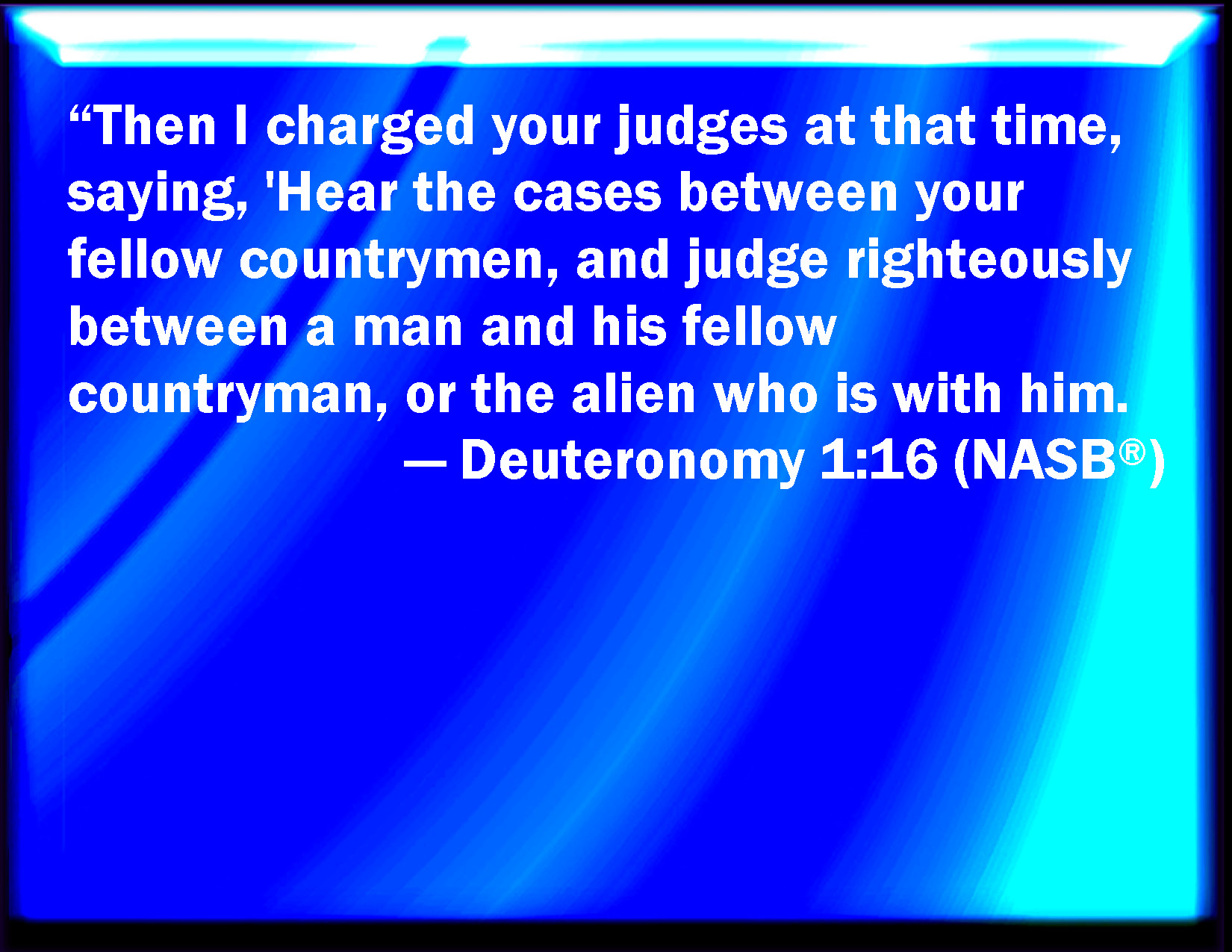 Bible Verse Slide Deuteronomy 1:16 And I charged your judges at that time, saying, Hear the causes between your brothers, and judge righteously between every man and his brother, and the stranger that is with him. KJV: And I charged your judges at that time, saying, Hear the causes between your brethren, and judge righteously between every man and his brother, and the stranger that is with him. DRB: And I commanded them, saying: Hear them, and judge that which is just: whether he be one of your country, or a stranger. DBT: And I commanded your judges at that time, saying, Hear the causes between your brethren, and judge righteously between a man and his brother, and him also that sojourneth with him. ERV: And I charged your judges at that time, saying, Hear the causes between your brethren, and judge righteously between a man and his brother, and the stranger that is with him. WBT: And I charged your judges at that time, saying, Hear the causes between your brethren, and judge righteously between every man and his brother, and the stranger that is with him. WEB: I commanded your judges at that time, saying, Hear [the causes] between your brothers, and judge righteously between a man and his brother, and the foreigner who is living with him. YLT: And I command your judges at that time, saying, Hearkening between your brethren — then ye have judged righteousness between a man, and his brother, and his sojourner;Links Deuteronomy 1:16 NIV • Deuteronomy 1:16 NLT • Deuteronomy 1:16 ESV • Deuteronomy 1:16 NASB • Deuteronomy 1:16 KJV • Deuteronomy 1:16 Interlinear • Deuteronomy 1:16 Commentaries • Deuteronomy 1:16 Parallel Texts • Deuteronomy 1:16 Bible Apps • Deuteronomy 1:16 Parallel • Bible Hub |