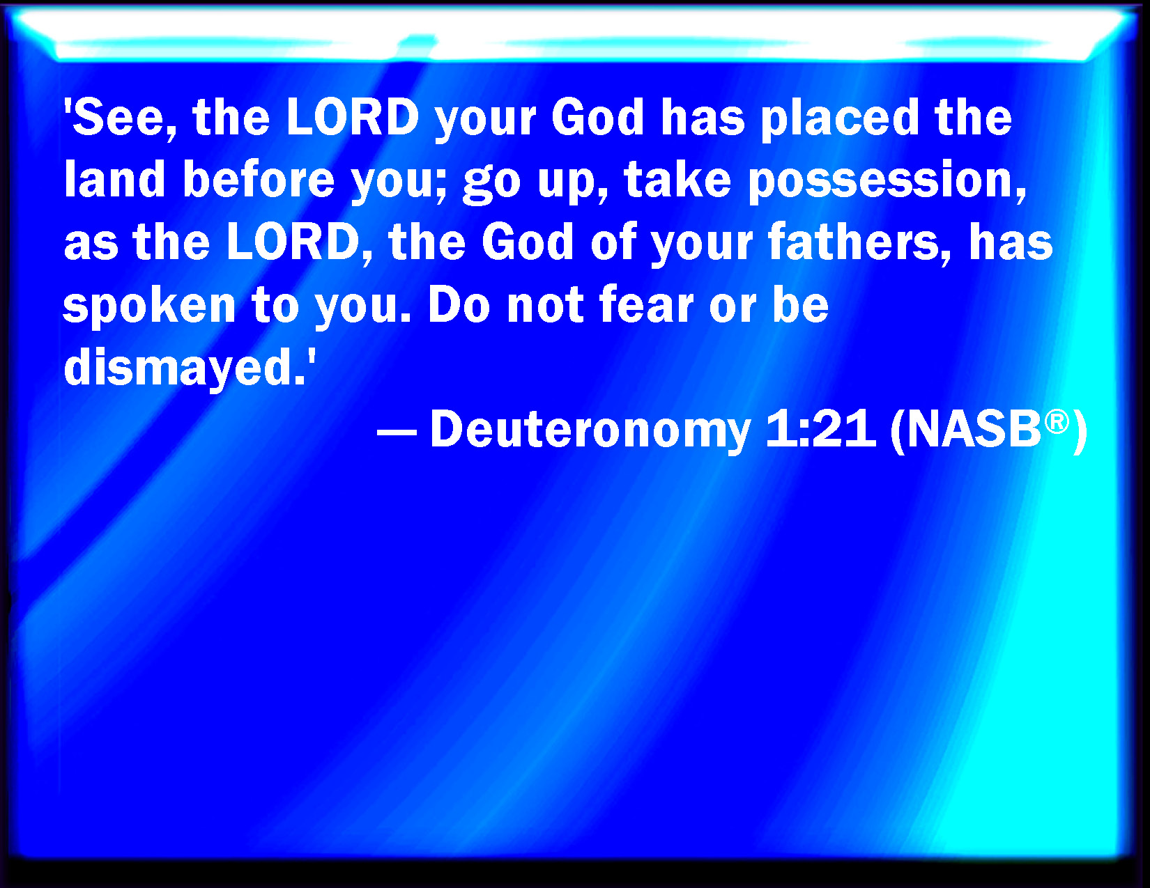 Bible Verse Slide Deuteronomy 1:21 Behold, the LORD your God has set the land before you: go up and possess it, as the LORD God of your fathers has said to you; fear not, neither be discouraged. KJV: Behold, the LORD thy God hath set the land before thee: go up and possess it, as the LORD God of thy fathers hath said unto thee; fear not, neither be discouraged. DRB: See the land which the Lord thy God giveth thee: go up and possess it, as the Lord our God hath spoken to thy fathers: fear not, nor be any way discouraged. DBT: Behold, Jehovah thy God hath set the land before thee: go up, take possession, as Jehovah the God of thy fathers hath said unto thee; fear not, neither be dismayed. ERV: Behold, the LORD thy God hath set the land before thee: go up, take possession, as the LORD, the God of thy fathers, hath spoken unto thee; fear not, neither be dismayed. WBT: Behold, the LORD thy God hath set the land before thee: go up and possess it, as the LORD God of thy fathers hath said to thee; fear not, neither be discouraged. WEB: Behold, Yahweh your God has set the land before you: go up, take possession, as Yahweh, the God of your fathers, has spoken to you; don't be afraid, neither be dismayed." YLT: see, Jehovah thy God hath set before thee the land; go up, possess, as Jehovah, God of thy fathers, hath spoken to thee; fear not, nor be affrighted.Links Deuteronomy 1:21 NIV • Deuteronomy 1:21 NLT • Deuteronomy 1:21 ESV • Deuteronomy 1:21 NASB • Deuteronomy 1:21 KJV • Deuteronomy 1:21 Interlinear • Deuteronomy 1:21 Commentaries • Deuteronomy 1:21 Parallel Texts • Deuteronomy 1:21 Bible Apps • Deuteronomy 1:21 Parallel • Bible Hub |