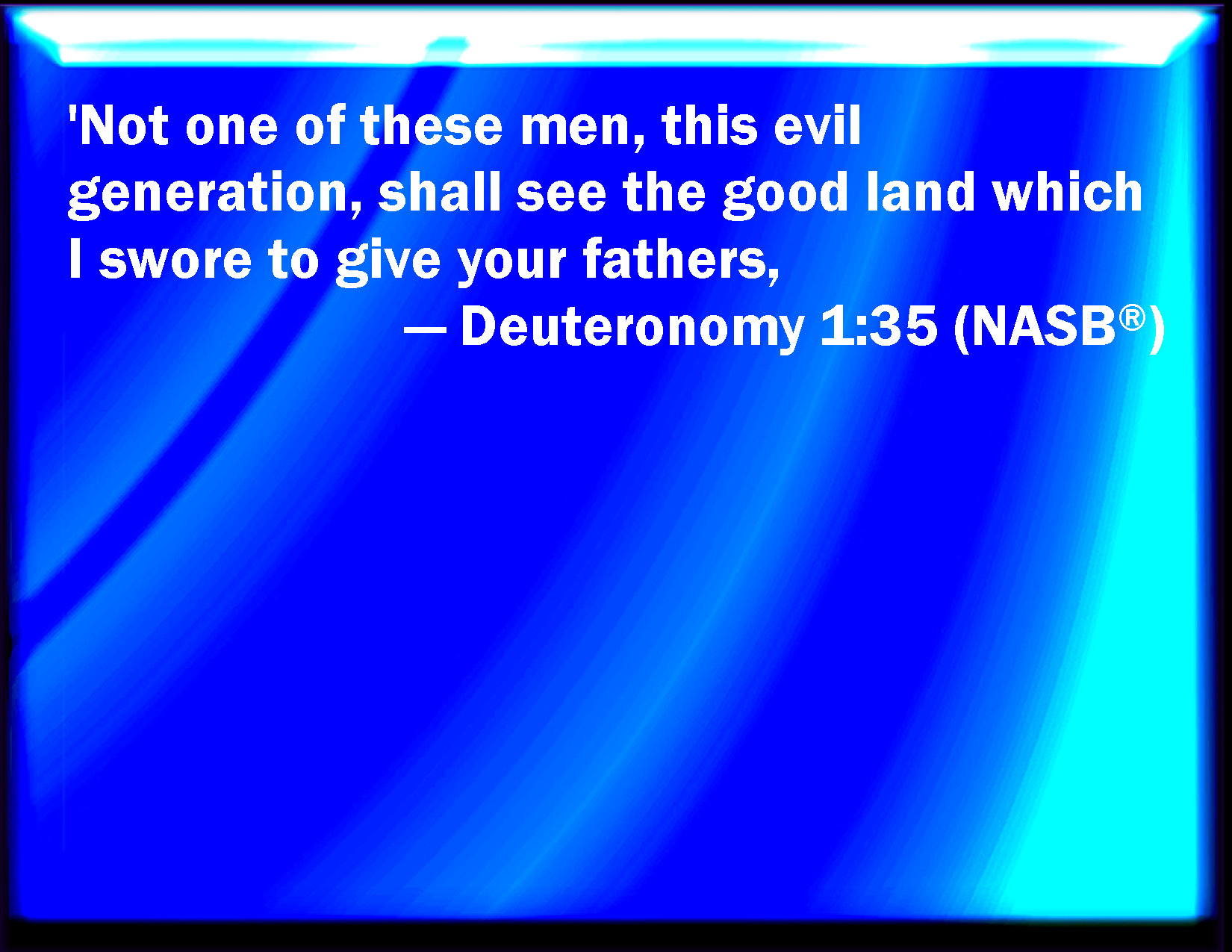 Bible Verse Slide Deuteronomy 1:35 Surely there shall not one of these men of this evil generation see that good land, which I swore to give to your fathers. KJV: Surely there shall not one of these men of this evil generation see that good land, which I sware to give unto your fathers, DRB: Not one of the men of this wicked generation shall see the good land, which I promised with an oath to your fathers: DBT: None among these men, this evil generation, shall in any wise see that good land, which I swore to give unto your fathers! ERV: Surely there shall not one of these men of this evil generation see the good land, which I sware to give unto your fathers, WBT: Surely there shall not one of these men of this evil generation see that good land, which I swore to give to your fathers, WEB: "Surely not one of these men of this evil generation shall see the good land, which I swore to give to your fathers, YLT: Not one of these men of this evil generation doth see the good land which I have sworn to give to your fathers,Links Deuteronomy 1:35 NIV • Deuteronomy 1:35 NLT • Deuteronomy 1:35 ESV • Deuteronomy 1:35 NASB • Deuteronomy 1:35 KJV • Deuteronomy 1:35 Interlinear • Deuteronomy 1:35 Commentaries • Deuteronomy 1:35 Parallel Texts • Deuteronomy 1:35 Bible Apps • Deuteronomy 1:35 Parallel • Bible Hub |