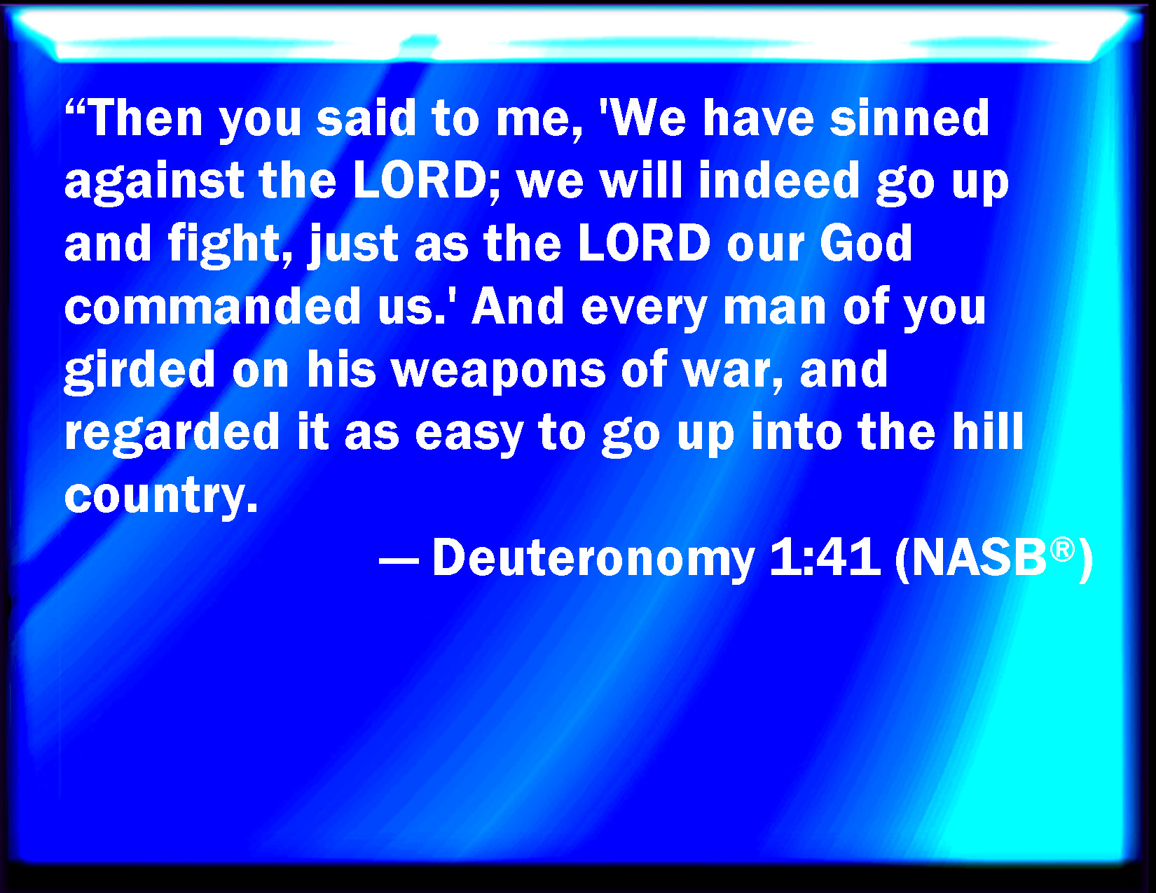 Bible Verse Slide Deuteronomy 1:41 Then you answered and said to me, We have sinned against the LORD, we will go up and fight, according to all that the LORD our God commanded us. And when you had girded on every man his weapons of war, you were ready to go up into the hill. KJV: Then ye answered and said unto me, We have sinned against the LORD, we will go up and fight, according to all that the LORD our God commanded us. And when ye had girded on every man his weapons of war, ye were ready to go up into the hill. DRB: And you answered me: We have sinned against the Lord: we will go up and fight, as the Lord our God hath commanded. And when you went ready armed unto the mountain, DBT: And ye answered And said unto me, We have sinned against Jehovah, We will go up And fight, according to all that Jehovah our God hath commanded us. And ye girded on Every man his weapons of war, And ye would go presumptuously up the hill. ERV: Then ye answered and said unto me, We have sinned against the LORD, we will go up and fight, according to all that the LORD our God commanded us. And ye girded on every man his weapons of war, and were forward to go up into the mountain. WBT: Then ye answered and said to me, We have sinned against the LORD, we will go up and fight, according to all that the LORD our God commanded us. And when ye had girded on every man his weapons of war, ye were ready to ascend the hill. WEB: Then you answered and said to me, "We have sinned against Yahweh, we will go up and fight, according to all that Yahweh our God commanded us." Every man of you put on his weapons of war, and presumed to go up into the hill country. YLT: And ye answer and say unto me, We have sinned against Jehovah; we — we go up, and we have fought, according to all that which Jehovah our God hath commanded us; and ye gird on each his weapons of war, and ye are ready to go up into the hill-country;Links Deuteronomy 1:41 NIV • Deuteronomy 1:41 NLT • Deuteronomy 1:41 ESV • Deuteronomy 1:41 NASB • Deuteronomy 1:41 KJV • Deuteronomy 1:41 Interlinear • Deuteronomy 1:41 Commentaries • Deuteronomy 1:41 Parallel Texts • Deuteronomy 1:41 Bible Apps • Deuteronomy 1:41 Parallel • Bible Hub |