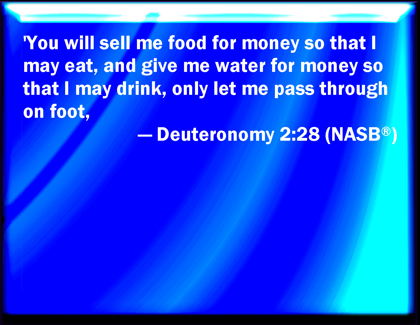 Bible Verse Slide Deuteronomy 2:28 You shall sell me meat for money, that I may eat; and give me water for money, that I may drink: only I will pass through on my feet; KJV: Thou shalt sell me meat for money, that I may eat; and give me water for money, that I may drink: only I will pass through on my feet; DRB: Sell us meat for money, that we may eat: give us water for money and so we will drink. We only ask that thou wilt let us pass through, DBT: Thou shalt sell me food for money that I may eat; and thou shalt give me water for money that I may drink; I will only pass through on my feet, ERV: Thou shalt sell me food for money, that I may eat; and give me water for money, that I may drink: only let me pass through on my feet; WBT: Thou shalt sell me food for money, that I may eat; and give me water for money, that I may drink: only I will pass through on my feet; WEB: You shall sell me food for money, that I may eat; and give me water for money, that I may drink: only let me pass through on my feet, YLT: food for money thou dost sell me, and I have eaten; and water for money thou dost give to me, and I have drunk; only, let me pass over on my feet, — Links Deuteronomy 2:28 NIV • Deuteronomy 2:28 NLT • Deuteronomy 2:28 ESV • Deuteronomy 2:28 NASB • Deuteronomy 2:28 KJV • Deuteronomy 2:28 Interlinear • Deuteronomy 2:28 Commentaries • Deuteronomy 2:28 Parallel Texts • Deuteronomy 2:28 Bible Apps • Deuteronomy 2:28 Parallel • Bible Hub |