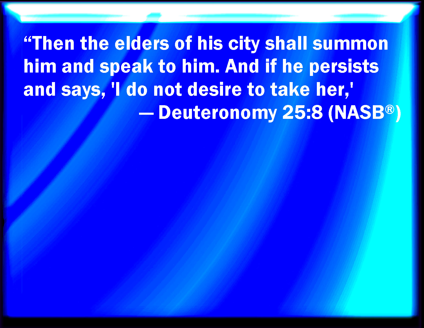 Bible Verse Slide Deuteronomy 25:8 Then the elders of his city shall call him, and speak to him: and if he stand to it, and say, I like not to take her; KJV: Then the elders of his city shall call him, and speak unto him: and if he stand to it, and say, I like not to take her; DRB: And they shall cause him to be sent for forthwith, and shall ask him. If he answer: I will not take her to wife: DBT: Then the elders of his city shall call him and speak unto him; and if he stand to it and say, I like not to take her; ERV: Then the elders of his city shall call him, and speak unto him: and if he stand, and say, I like not to take her; WBT: Then the elders of his city shall call him, and speak to him: and if he shall stand to it, and say, I like not to take her, WEB: Then the elders of his city shall call him, and speak to him: and if he stand, and say, "I don't want to take her;" YLT: and the elders of his city have called for him, and spoken unto him, and he hath stood and said, I have no desire to take her;Links Deuteronomy 25:8 NIV • Deuteronomy 25:8 NLT • Deuteronomy 25:8 ESV • Deuteronomy 25:8 NASB • Deuteronomy 25:8 KJV • Deuteronomy 25:8 Interlinear • Deuteronomy 25:8 Commentaries • Deuteronomy 25:8 Parallel Texts • Deuteronomy 25:8 Bible Apps • Deuteronomy 25:8 Parallel • Bible Hub |