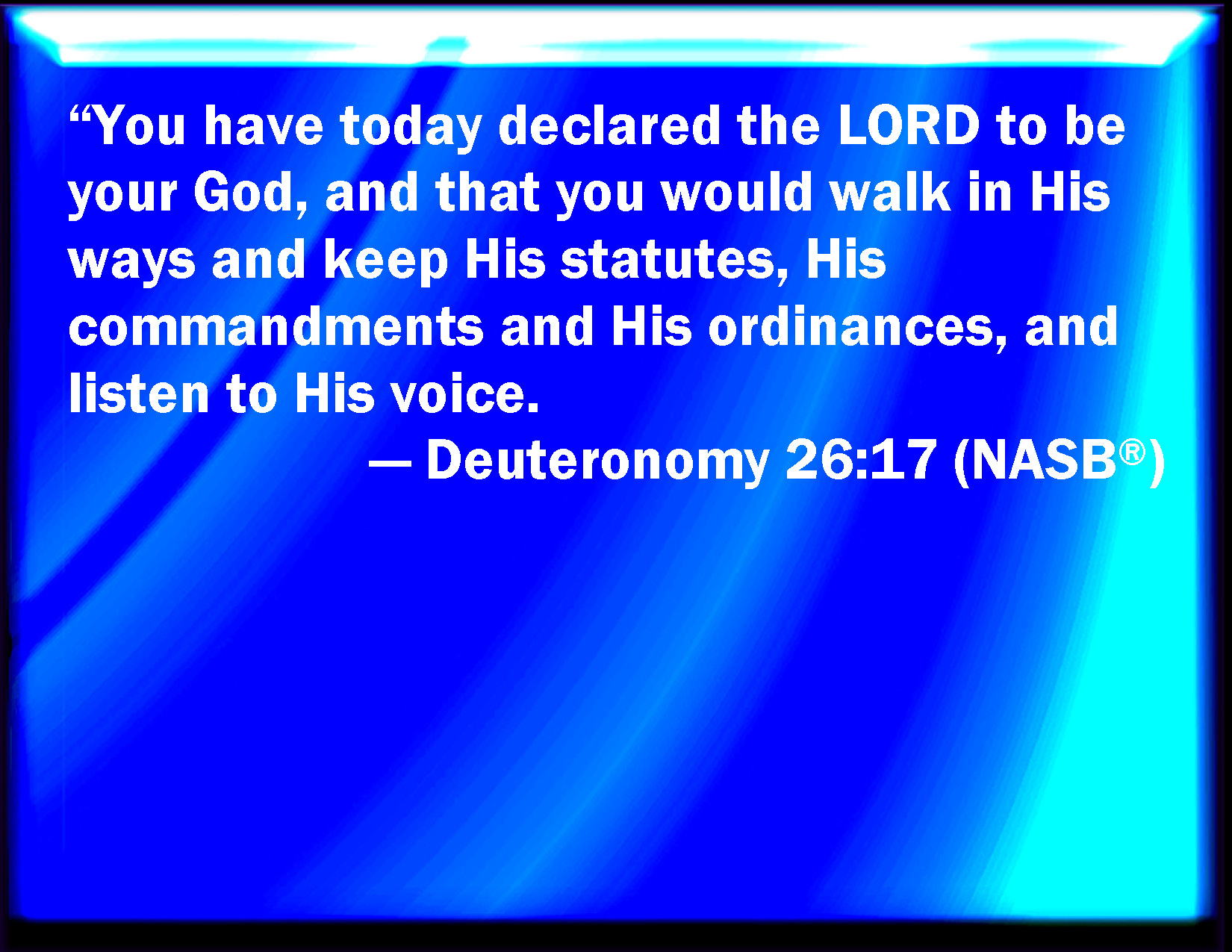 Bible Verse Slide Deuteronomy 26:17 You have avouched the LORD this day to be your God, and to walk in his ways, and to keep his statutes, and his commandments, and his judgments, and to listen to his voice: KJV: Thou hast avouched the LORD this day to be thy God, and to walk in his ways, and to keep his statutes, and his commandments, and his judgments, and to hearken unto his voice: DRB: Thou hast chosen the Lord this day to be thy God, and to walk in his ways and keep his ceremonies, and precepts, end judgments, and obey his command. DBT: Thou hast this day accepted Jehovah to be thy God, and to walk in his ways, and keep his statutes, and his commandments, and his ordinances, and to hearken unto his voice; ERV: Thou hast avouched the LORD this day to be thy God, and that thou shouldest walk in his ways, and keep his statutes, and his commandments, and his judgments, and hearken unto his voice: WBT: Thou hast avouched the LORD this day to be thy God, and to walk in his ways, and to keep his statutes, and his commandments, and his judgments, and to hearken to his voice: WEB: You have declared Yahweh this day to be your God, and that you would walk in his ways, and keep his statutes, and his commandments, and his ordinances, and listen to his voice: YLT: Jehovah thou hast caused to promise to-day to become thy God, and to walk in His ways, and to keep His statutes, and His commands, and His judgments, and to hearken to His voice.Links Deuteronomy 26:17 NIV • Deuteronomy 26:17 NLT • Deuteronomy 26:17 ESV • Deuteronomy 26:17 NASB • Deuteronomy 26:17 KJV • Deuteronomy 26:17 Interlinear • Deuteronomy 26:17 Commentaries • Deuteronomy 26:17 Parallel Texts • Deuteronomy 26:17 Bible Apps • Deuteronomy 26:17 Parallel • Bible Hub |