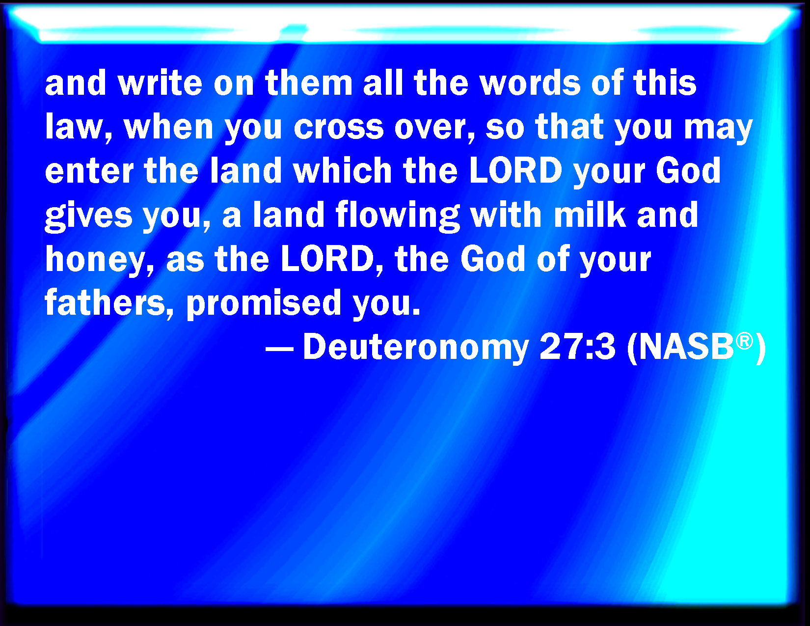 Bible Verse Slide Deuteronomy 27:3 And you shall write on them all the words of this law, when you are passed over, that you may go in to the land which the LORD your God gives you, a land that flows with milk and honey; as the LORD God of your fathers has promised you. KJV: And thou shalt write upon them all the words of this law, when thou art passed over, that thou mayest go in unto the land which the LORD thy God giveth thee, a land that floweth with milk and honey; as the LORD God of thy fathers hath promised thee. DRB: That thou mayst write on them all the words of this law, when thou art passed over the Jordan: that thou mayst enter into the land which the Lord thy God will give thee, a land flowing with milk and honey, as he swore to thy fathers. DBT: and thou shalt write upon them all the words of this law, when thou goest over that thou mayest enter into the land which Jehovah thy God giveth thee, a land flowing with milk and honey, as Jehovah the God of thy fathers hath promised thee. ERV: and thou shalt write upon them all the words of this law, when thou art passed over; that thou mayest go in unto the land which the LORD thy God giveth thee, a land flowing with milk and honey, as the LORD, the God of thy fathers, hath promised thee. WBT: And thou shalt write upon them all the words of this law, when thou hast passed over, that thou mayest enter in to the land which the LORD thy God giveth thee, a land that floweth with milk and honey; as the LORD God of thy fathers hath promised thee. WEB: and you shall write on them all the words of this law, when you have passed over; that you may go in to the land which Yahweh your God gives you, a land flowing with milk and honey, as Yahweh, the God of your fathers, has promised you. YLT: and written on them all the words of this law in thy passing over, so that thou goest in unto the land which Jehovah thy God is giving to thee — a land flowing with milk and honey, as Jehovah, God of thy fathers, hath spoken to thee.Links Deuteronomy 27:3 NIV • Deuteronomy 27:3 NLT • Deuteronomy 27:3 ESV • Deuteronomy 27:3 NASB • Deuteronomy 27:3 KJV • Deuteronomy 27:3 Interlinear • Deuteronomy 27:3 Commentaries • Deuteronomy 27:3 Parallel Texts • Deuteronomy 27:3 Bible Apps • Deuteronomy 27:3 Parallel • Bible Hub |