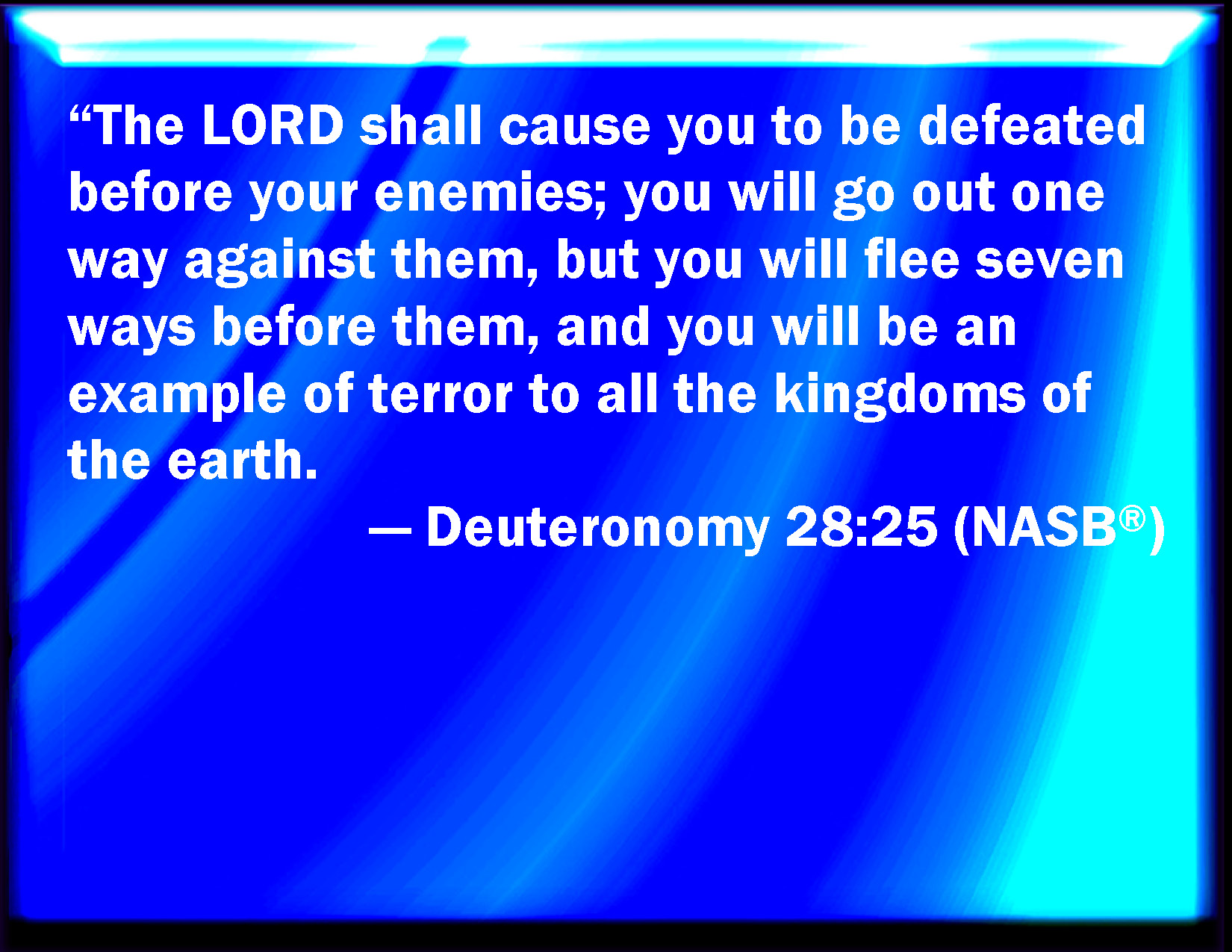 Bible Verse Slide Deuteronomy 28:25 The LORD shall cause you to be smitten before your enemies: you shall go out one way against them, and flee seven ways before them: and shall be removed into all the kingdoms of the earth. KJV: The LORD shall cause thee to be smitten before thine enemies: thou shalt go out one way against them, and flee seven ways before them: and shalt be removed into all the kingdoms of the earth. DRB: The Lord make thee to fall down before thy enemies, one way mayst thou go out against them, and flee seven ways, and be scattered throughout all the kingdoms of the earth. DBT: Jehovah will give thee up smitten before thine enemies; thou shalt go out against them one way, and by seven ways shalt thou flee before them; and thou shalt be driven hither and thither into all the kingdoms of the earth. ERV: The LORD shall cause thee to be smitten before thine enemies: thou shalt go out one way against them, and shalt flee seven ways before them: and thou shalt be tossed to and fro among all the kingdoms of the earth. WBT: The LORD shall cause thee to be smitten before thy enemies: thou shalt go out one way against them, and flee seven ways before them; and shalt be removed into all the kingdoms of the earth. WEB: Yahweh will cause you to be struck before your enemies; you shall go out one way against them, and shall flee seven ways before them: and you shall be tossed back and forth among all the kingdoms of the earth. YLT: 'Jehovah giveth thee smitten before thine enemies; in one way thou goest out unto them, and in seven ways dost flee before them, and thou hast been for a trembling to all kingdoms of the earth;Links Deuteronomy 28:25 NIV • Deuteronomy 28:25 NLT • Deuteronomy 28:25 ESV • Deuteronomy 28:25 NASB • Deuteronomy 28:25 KJV • Deuteronomy 28:25 Interlinear • Deuteronomy 28:25 Commentaries • Deuteronomy 28:25 Parallel Texts • Deuteronomy 28:25 Bible Apps • Deuteronomy 28:25 Parallel • Bible Hub |