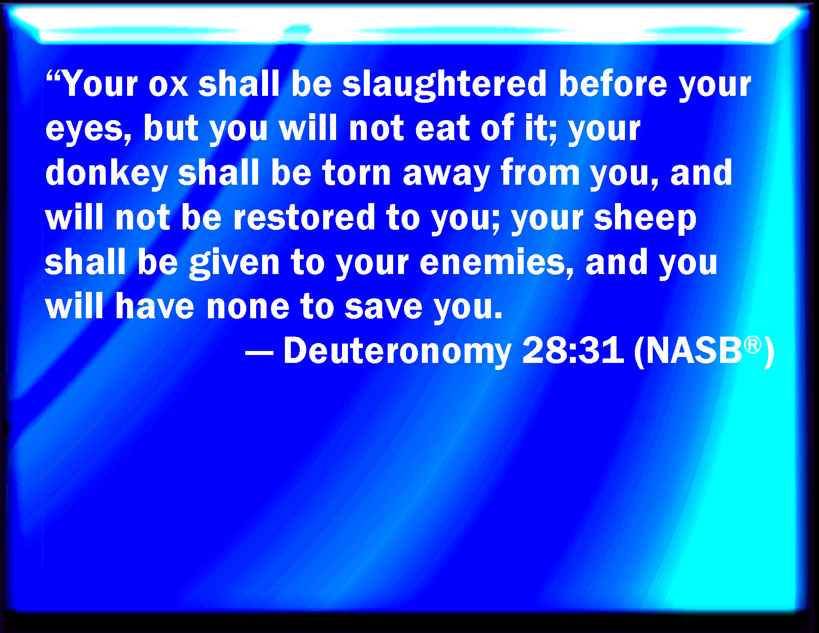 Bible Verse Slide Deuteronomy 28:31 Your ox shall be slain before your eyes, and you shall not eat thereof: your ass shall be violently taken away from before your face, and shall not be restored to you: your sheep shall be given to your enemies, and you shall have none to rescue them. KJV: Thine ox shall be slain before thine eyes, and thou shalt not eat thereof: thine ass shall be violently taken away from before thy face, and shall not be restored to thee: thy sheep shall be given unto thine enemies, and thou shalt have none to rescue them. DRB: May thy ox be slain before thee, and thou not eat thereof. May thy ass be taken away in thy sight, and not restored to thee. May thy sheep be given to thy enemies, and may there be none to help thee. DBT: Thine ox shall be slaughtered before thine eyes, and thou shalt not eat thereof; thine ass shall be snatched away from before thy face, and shall not return to thee; thy sheep shall be given unto thine enemies, and thou shalt have none to recover them. ERV: Thine ox shall be slain before thine eyes, and thou shalt not eat thereof: thine ass shall be violently taken away from before thy face, and shall not be restored to thee: thy sheep shall be given unto thine enemies, and thou shalt have none to save thee. WBT: Thy ox shall be slain before thy eyes, and thou shalt not eat of it: thy ass shall be violently taken away from before thy face, and shall not be restored to thee: thy sheep shall be given to thy enemies, and thou shalt have none to rescue them. WEB: Your ox shall be slain before your eyes, and you shall not eat of it: your donkey shall be violently taken away from before your face, and shall not be restored to you: your sheep shall be given to your enemies, and you shall have none to save you. YLT: thine ox is slaughtered before thine eyes, and thou dost not eat of it; thine ass is taken violently away from before thee, and it is not given back to thee; thy sheep are given to thine enemies, and there is no saviour for thee.Links Deuteronomy 28:31 NIV • Deuteronomy 28:31 NLT • Deuteronomy 28:31 ESV • Deuteronomy 28:31 NASB • Deuteronomy 28:31 KJV • Deuteronomy 28:31 Interlinear • Deuteronomy 28:31 Commentaries • Deuteronomy 28:31 Parallel Texts • Deuteronomy 28:31 Bible Apps • Deuteronomy 28:31 Parallel • Bible Hub |