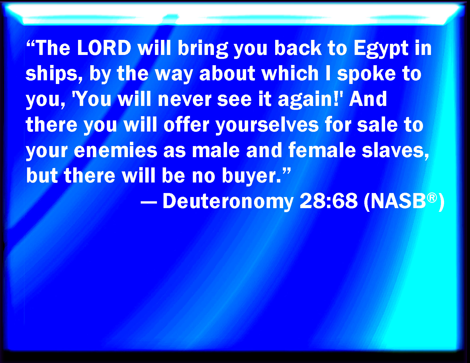 Bible Verse Slide Deuteronomy 28:68 And the LORD shall bring you into Egypt again with ships, by the way whereof I spoke to you, You shall see it no more again: and there you shall be sold to your enemies for slaves and bondwomen, and no man shall buy you. KJV: And the LORD shall bring thee into Egypt again with ships, by the way whereof I spake unto thee, Thou shalt see it no more again: and there ye shall be sold unto your enemies for bondmen and bondwomen, and no man shall buy you. DRB: The Lord shall bring thee again with ships into Egypt, by the way whereof he said to thee that thou shouldst see it no more. There shalt thou be set to sale to thy enemies for bondmen and bondwomen, and no man shall buy you. DBT: And Jehovah will bring thee into Egypt again with ships, by the way whereof I said unto thee, Thou shalt see it again no more; and there ye shall be sold unto your enemies for bondmen and bondwomen, and there shall be no man to buy you. ERV: And the LORD shall bring thee into Egypt again with ships, by the way whereof I said unto thee, Thou shalt see it no more again: and there ye shall sell yourselves unto your enemies for bondmen and for bondwomen, and no man shall buy you. WBT: And the LORD shall bring thee into Egypt again with ships, by the way of which I have said to thee, Thou shalt see it no more again: and there ye shall be sold to your enemies for bond-men and bond-women, and no man shall buy you. WEB: Yahweh will bring you into Egypt again with ships, by the way of which I said to you, You shall see it no more again: and there you shall sell yourselves to your enemies for bondservants and for bondmaids, and no man shall buy you. YLT: 'And Jehovah hath brought thee back to Egypt with ships, by a way of which I said to thee, Thou dost not add any more to see it, and ye have sold yourselves there to thine enemies, for men-servants and for maid-servants, and there is no buyer.'Links Deuteronomy 28:68 NIV • Deuteronomy 28:68 NLT • Deuteronomy 28:68 ESV • Deuteronomy 28:68 NASB • Deuteronomy 28:68 KJV • Deuteronomy 28:68 Interlinear • Deuteronomy 28:68 Commentaries • Deuteronomy 28:68 Parallel Texts • Deuteronomy 28:68 Bible Apps • Deuteronomy 28:68 Parallel • Bible Hub |
