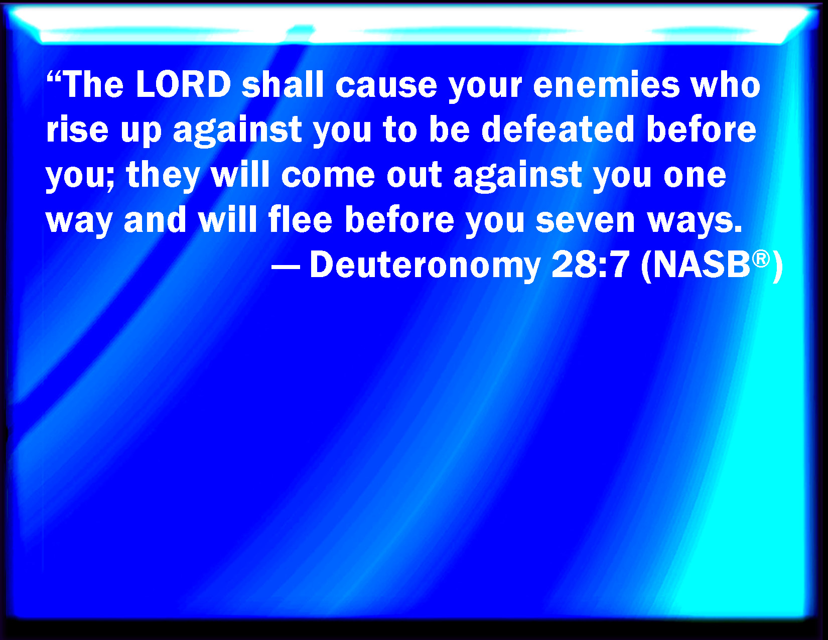 Bible Verse Slide Deuteronomy 28:7 The LORD shall cause your enemies that rise up against you to be smitten before your face: they shall come out against you one way, and flee before you seven ways. KJV: The LORD shall cause thine enemies that rise up against thee to be smitten before thy face: they shall come out against thee one way, and flee before thee seven ways. DRB: The Lord shall cause thy enemies, that rise up against thee, to fall down before thy face: one way shall they come out against thee, and seven ways shall they flee before thee. DBT: Jehovah will give up, smitten before thee, thine enemies that rise up against thee; they shall come out against thee one way, and by seven ways shall they flee before thee. ERV: The LORD shall cause thine enemies that rise up against thee to be smitten before thee: they shall come out against thee one way, and shall flee before thee seven ways. WBT: The LORD shall cause thy enemies that rise up against thee to be smitten before thy face: they shall come out against thee one way, and flee before thee seven ways. WEB: Yahweh will cause your enemies who rise up against you to be struck before you. They will come out against you one way, and will flee before you seven ways. YLT: Jehovah giveth thine enemies, who are rising up against thee — smitten before thy face; in one way they come out unto thee, and in seven ways they flee before thee.Links Deuteronomy 28:7 NIV • Deuteronomy 28:7 NLT • Deuteronomy 28:7 ESV • Deuteronomy 28:7 NASB • Deuteronomy 28:7 KJV • Deuteronomy 28:7 Interlinear • Deuteronomy 28:7 Commentaries • Deuteronomy 28:7 Parallel Texts • Deuteronomy 28:7 Bible Apps • Deuteronomy 28:7 Parallel • Bible Hub |