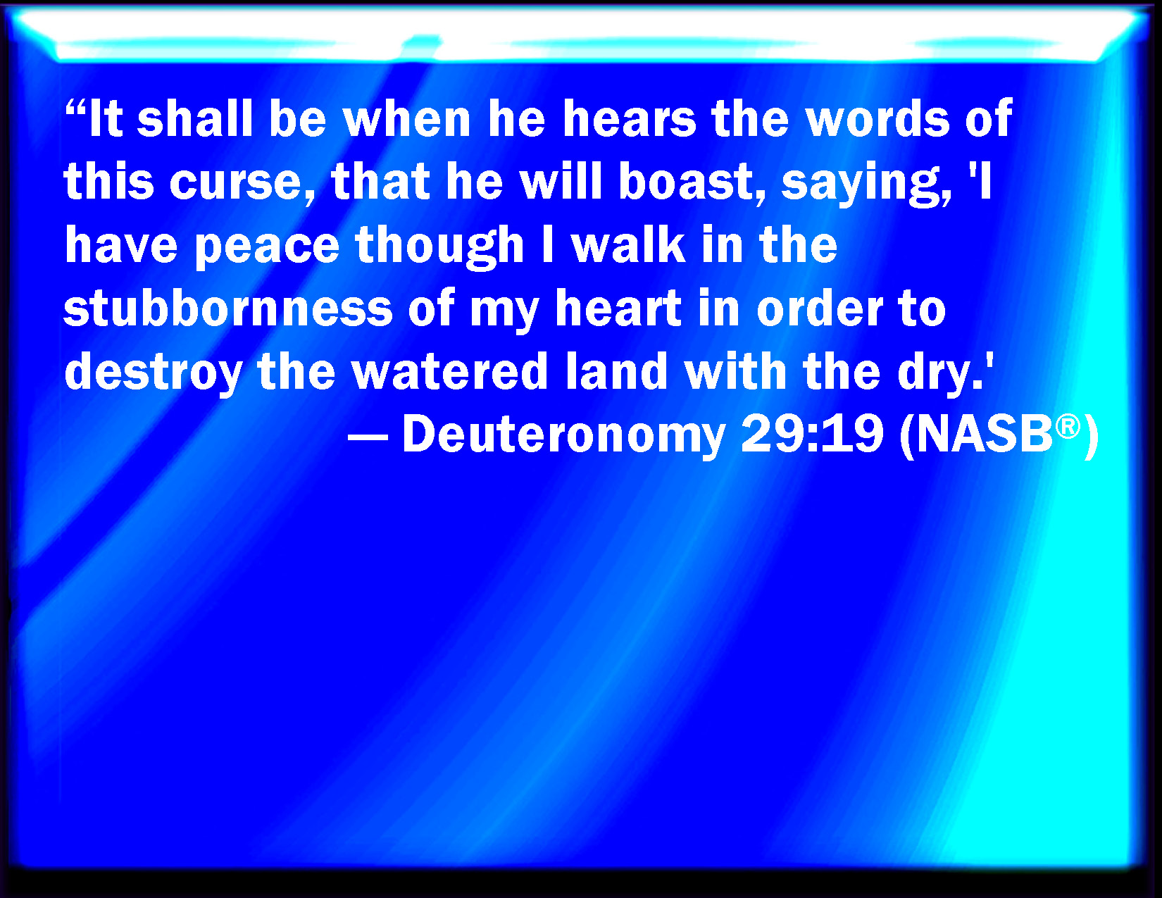 Bible Verse Slide Deuteronomy 29:19 And it come to pass, when he hears the words of this curse, that he bless himself in his heart, saying, I shall have peace, though I walk in the imagination of my heart, to add drunkenness to thirst: KJV: And it come to pass, when he heareth the words of this curse, that he bless himself in his heart, saying, I shall have peace, though I walk in the imagination of mine heart, to add drunkenness to thirst: DRB: And when he shall hear the words of this oath, he should bless himself in his heart saying: I shall have peace, and will walk on in the naughtiness of my heart: and the drunken may consume the thirsty, DBT: and it come to pass, when he heareth the words of this curse, that he bless himself in his heart, saying, I shall have peace, though I walk in the stubbornness of my heart, to sweep away the drunken with the thirsty. ERV: and it come to pass, when he heareth the words of this curse, that he bless himself in his heart, saying, I shall have peace, though I walk in the stubbornness of mine heart, to destroy the moist with the dry: WBT: And it should come to pass, when he heareth the words of this curse, that he should bless himself in his heart, saying, I shall have peace, though I walk in the imagination of my heart, to add drunkenness to thirst: WEB: and it happen, when he hears the words of this curse, that he bless himself in his heart, saying, "I shall have peace, though I walk in the stubbornness of my heart, to destroy the moist with the dry." YLT: 'And it hath been, in his hearing the words of this oath, and he hath blessed himself in his heart, saying, I have peace, though in the stubbornness of my heart I go on, in order to end the fulness with the thirst.Links Deuteronomy 29:19 NIV • Deuteronomy 29:19 NLT • Deuteronomy 29:19 ESV • Deuteronomy 29:19 NASB • Deuteronomy 29:19 KJV • Deuteronomy 29:19 Interlinear • Deuteronomy 29:19 Commentaries • Deuteronomy 29:19 Parallel Texts • Deuteronomy 29:19 Bible Apps • Deuteronomy 29:19 Parallel • Bible Hub |