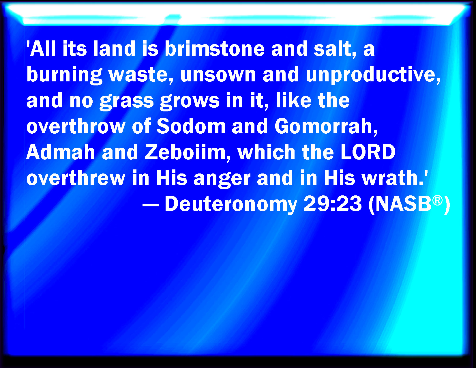 Bible Verse Slide Deuteronomy 29:23 And that the whole land thereof is brimstone, and salt, and burning, that it is not sown, nor bears, nor any grass grows therein, like the overthrow of Sodom, and Gomorrah, Admah, and Zeboim, which the LORD overthrew in his anger, and in his wrath: KJV: And that the whole land thereof is brimstone, and salt, and burning, that it is not sown, nor beareth, nor any grass groweth therein, like the overthrow of Sodom, and Gomorrah, Admah, and Zeboim, which the LORD overthrew in his anger, and in his wrath: DRB: Burning it with brimstone, and the heat of salt, so that it cannot be sown any more, nor any green thing grow therein, after the example of the destruction of Sodom and Gomorrha, Adama and Seboim, which the Lord destroyed in his wrath and indignation: DBT: that the whole ground thereof is brimstone and salt, and burning, that it is not sown, nor beareth, and no grass groweth in it, like the overthrow of Sodom and Gomorrah, Admah and Zeboim, which Jehovah overthrew in his anger and in his fury: ERV: and that the whole land thereof is brimstone, and salt, and a burning, that it is not sown, nor beareth, nor any grass groweth therein, like the overthrow of Sodom and Gomorrah, Admah and Zeboiim, which the LORD overthrew in his anger, and in his wrath: WBT: And that the whole land of it is brimstone, and salt, and burning, that it is not sown, nor doth it bear, nor doth any grass grow in it, like the overthrow of Sodom, and Gomorrah, Admah, and Zeboim, which the LORD overthrew in his anger and in his wrath: WEB: [and that] the whole land of it is sulfur, and salt, [and] a burning, [that] it is not sown, nor bears, nor any grass grows therein, like the overthrow of Sodom and Gomorrah, Admah and Zeboiim, which Yahweh overthrew in his anger, and in his wrath: YLT: (with brimstone and salt is the whole land burnt, it is not sown, nor doth it shoot up, nor doth there go up on it any herb, like the overthrow of Sodom and Gomorrah, Admah and Zeboim, which Jehovah overturned in His anger, and in His fury,) — Links Deuteronomy 29:23 NIV • Deuteronomy 29:23 NLT • Deuteronomy 29:23 ESV • Deuteronomy 29:23 NASB • Deuteronomy 29:23 KJV • Deuteronomy 29:23 Interlinear • Deuteronomy 29:23 Commentaries • Deuteronomy 29:23 Parallel Texts • Deuteronomy 29:23 Bible Apps • Deuteronomy 29:23 Parallel • Bible Hub |