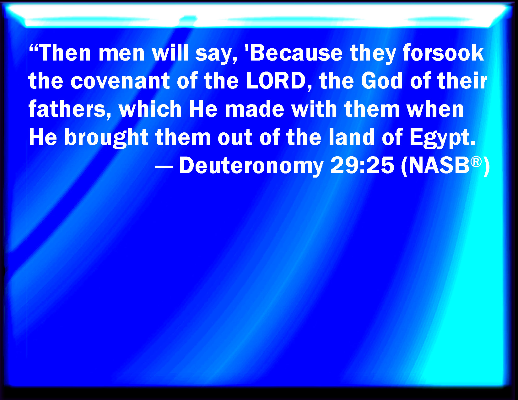 Bible Verse Slide Deuteronomy 29:25 Then men shall say, Because they have forsaken the covenant of the LORD God of their fathers, which he made with them when he brought them forth out of the land of Egypt: KJV: Then men shall say, Because they have forsaken the covenant of the LORD God of their fathers, which he made with them when he brought them forth out of the land of Egypt: DRB: And they shall answer: Because they forsook the covenant of the Lord, which he made with their fathers, when he brought them out of the land of Egypt: DBT: And men shall say, Because they have forsaken the covenant of Jehovah the God of their fathers, which he had made with them when he brought them forth out of the land of Egypt; ERV: Then men shall say, Because they forsook the covenant of the LORD, the God of their fathers, which he made with them when he brought them forth out of the land of Egypt; WBT: Then men shall say, Because they have forsaken the covenant of the LORD God of their fathers, which he made with them when he brought them forth from the land of Egypt: WEB: Then men shall say, "Because they forsook the covenant of Yahweh, the God of their fathers, which he made with them when he brought them forth out of the land of Egypt, YLT: 'And they have said, Because that they have forsaken the covenant of Jehovah, God of their fathers, which He made with them in His bringing them out of the land of Egypt,Links Deuteronomy 29:25 NIV • Deuteronomy 29:25 NLT • Deuteronomy 29:25 ESV • Deuteronomy 29:25 NASB • Deuteronomy 29:25 KJV • Deuteronomy 29:25 Interlinear • Deuteronomy 29:25 Commentaries • Deuteronomy 29:25 Parallel Texts • Deuteronomy 29:25 Bible Apps • Deuteronomy 29:25 Parallel • Bible Hub |
