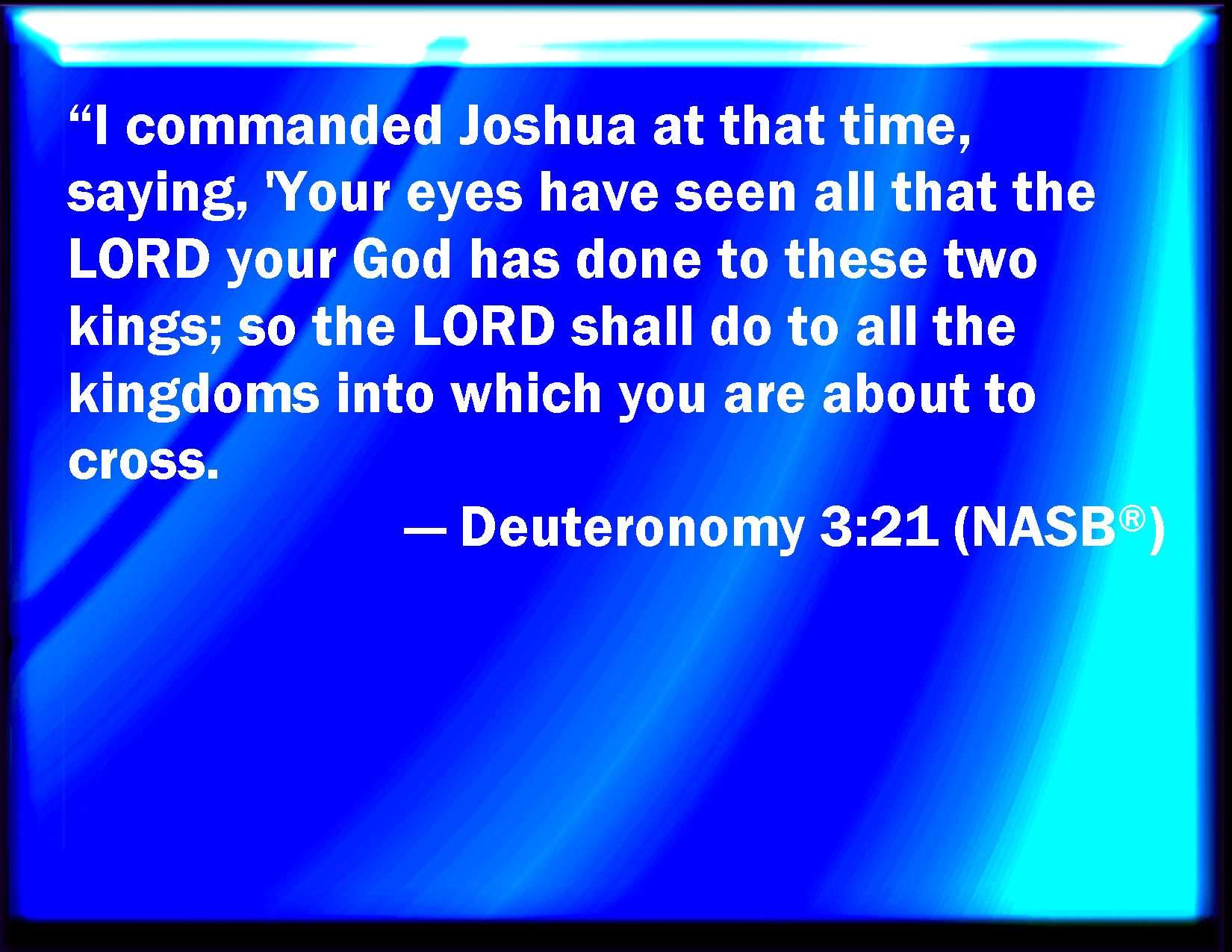 Bible Verse Slide Deuteronomy 3:21 And I commanded Joshua at that time, saying, Your eyes have seen all that the LORD your God has done to these two kings: so shall the LORD do to all the kingdoms where you pass. KJV: And I commanded Joshua at that time, saying, Thine eyes have seen all that the LORD your God hath done unto these two kings: so shall the LORD do unto all the kingdoms whither thou passest. DRB: I commanded Josue also at that time, saying: Thy eyes have seen what the Lord your God hath done to these two kings: so will he do to all the king- dome to which thou shalt pass. DBT: And I commanded Joshua at that time, saying, Thine eyes have seen all that Jehovah your God hath done to these two kings: so will Jehovah do to all the kingdoms to which thou shalt go. ERV: And I commanded Joshua at that time, saying, Thine eyes have seen all that the LORD your God hath done unto these two kings: so shall the LORD do unto all the kingdoms whither thou goest over. WBT: And I commanded Joshua at that time, saying, Thy eyes have seen all that the LORD your God hath done to these two kings: so shall the LORD do to all the kingdoms whither thou passest. WEB: I commanded Joshua at that time, saying, "Your eyes have seen all that Yahweh your God has done to these two kings: so shall Yahweh do to all the kingdoms where you go over. YLT: And Jehoshua I have commanded at that time, saying, Thine eyes are seeing all that which Jehovah your God hath done to these two kings — so doth Jehovah to all the kingdoms whither thou are passing over;Links Deuteronomy 3:21 NIV • Deuteronomy 3:21 NLT • Deuteronomy 3:21 ESV • Deuteronomy 3:21 NASB • Deuteronomy 3:21 KJV • Deuteronomy 3:21 Interlinear • Deuteronomy 3:21 Commentaries • Deuteronomy 3:21 Parallel Texts • Deuteronomy 3:21 Bible Apps • Deuteronomy 3:21 Parallel • Bible Hub |