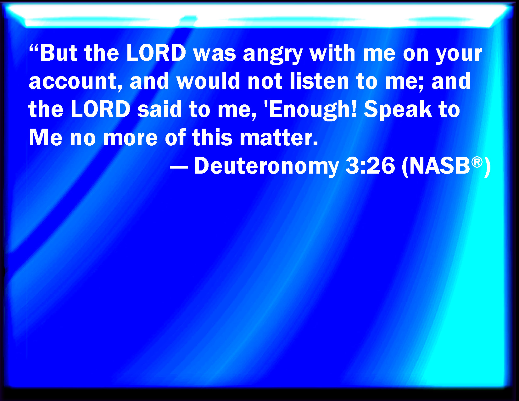 Bible Verse Slide Deuteronomy 3:26 But the LORD was wroth with me for your sakes, and would not hear me: and the LORD said to me, Let it suffice you; speak no more to me of this matter. KJV: But the LORD was wroth with me for your sakes, and would not hear me: and the LORD said unto me, Let it suffice thee; speak no more unto me of this matter. DRB: And the Lord was angry with me on your account and heard me not, but said to me: It is enough: speak no more to me of this matter. DBT: But Jehovah was wroth with me on your account, and did not hear me; and Jehovah said to me, Let it suffice thee; speak no more unto me of this matter! ERV: But the LORD was wroth with me for your sakes, and hearkened not unto me: and the LORD said unto me, Let it suffice thee; speak no more unto me of this matter. WBT: But the LORD was wroth with me for your sakes, and would not hear me: and the LORD said to me, Let it suffice thee; speak no more to me of this matter. WEB: But Yahweh was angry with me for your sakes, and didn't listen to me; and Yahweh said to me, "Let it suffice you; speak no more to me of this matter. YLT: 'And Jehovah sheweth himself wroth with me, for your sake, and hath not hearkened unto me, and Jehovah saith unto me, Enough for thee; add not to speak unto Me any more about this thing:Links Deuteronomy 3:26 NIV • Deuteronomy 3:26 NLT • Deuteronomy 3:26 ESV • Deuteronomy 3:26 NASB • Deuteronomy 3:26 KJV • Deuteronomy 3:26 Interlinear • Deuteronomy 3:26 Commentaries • Deuteronomy 3:26 Parallel Texts • Deuteronomy 3:26 Bible Apps • Deuteronomy 3:26 Parallel • Bible Hub |