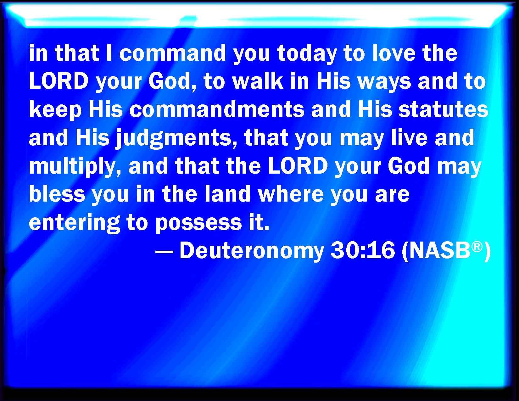 Bible Verse Slide Deuteronomy 30:16 In that I command you this day to love the LORD your God, to walk in his ways, and to keep his commandments and his statutes and his judgments, that you may live and multiply: and the LORD your God shall bless you in the land where you go to possess it. KJV: In that I command thee this day to love the LORD thy God, to walk in his ways, and to keep his commandments and his statutes and his judgments, that thou mayest live and multiply: and the LORD thy God shall bless thee in the land whither thou goest to possess it. DRB: That thou mayst love the Lord thy God, and walk in his ways, and keep his commandments and ceremonies and judgments, and thou mayst live, and he may multiply thee, and bless thee in the land, which thou shalt go in to possess. DBT: in that I command thee this day to love Jehovah thy God, to walk in his ways, and to keep his commandments and his statutes and his ordinances, that thou mayest live and multiply, and that Jehovah thy God may bless thee in the land whither thou goest to possess it. ERV: in that I command thee this day to love the LORD thy God, to walk in his ways, and to keep his commandments and his statutes and his judgments, that thou mayest live and multiply, and that the LORD thy God may bless thee in the land whither thou goest in to possess it. WBT: In that I command thee this day to love the LORD thy God, to walk in his ways, and to keep his commandments, and his statutes, and his judgments, that thou mayest live and multiply: and the LORD thy God shall bless thee in the land whither thou goest to possess it. WEB: in that I command you this day to love Yahweh your God, to walk in his ways, and to keep his commandments and his statutes and his ordinances, that you may live and multiply, and that Yahweh your God may bless you in the land where you go in to possess it. YLT: in that I am commanding thee to-day to love Jehovah thy God, to walk in His ways, and to keep His commands, and His statutes, and His judgments; and thou hast lived and multiplied, and Jehovah thy God hath blessed thee in the land whither thou art going in to possess it.Links Deuteronomy 30:16 NIV • Deuteronomy 30:16 NLT • Deuteronomy 30:16 ESV • Deuteronomy 30:16 NASB • Deuteronomy 30:16 KJV • Deuteronomy 30:16 Interlinear • Deuteronomy 30:16 Commentaries • Deuteronomy 30:16 Parallel Texts • Deuteronomy 30:16 Bible Apps • Deuteronomy 30:16 Parallel • Bible Hub |