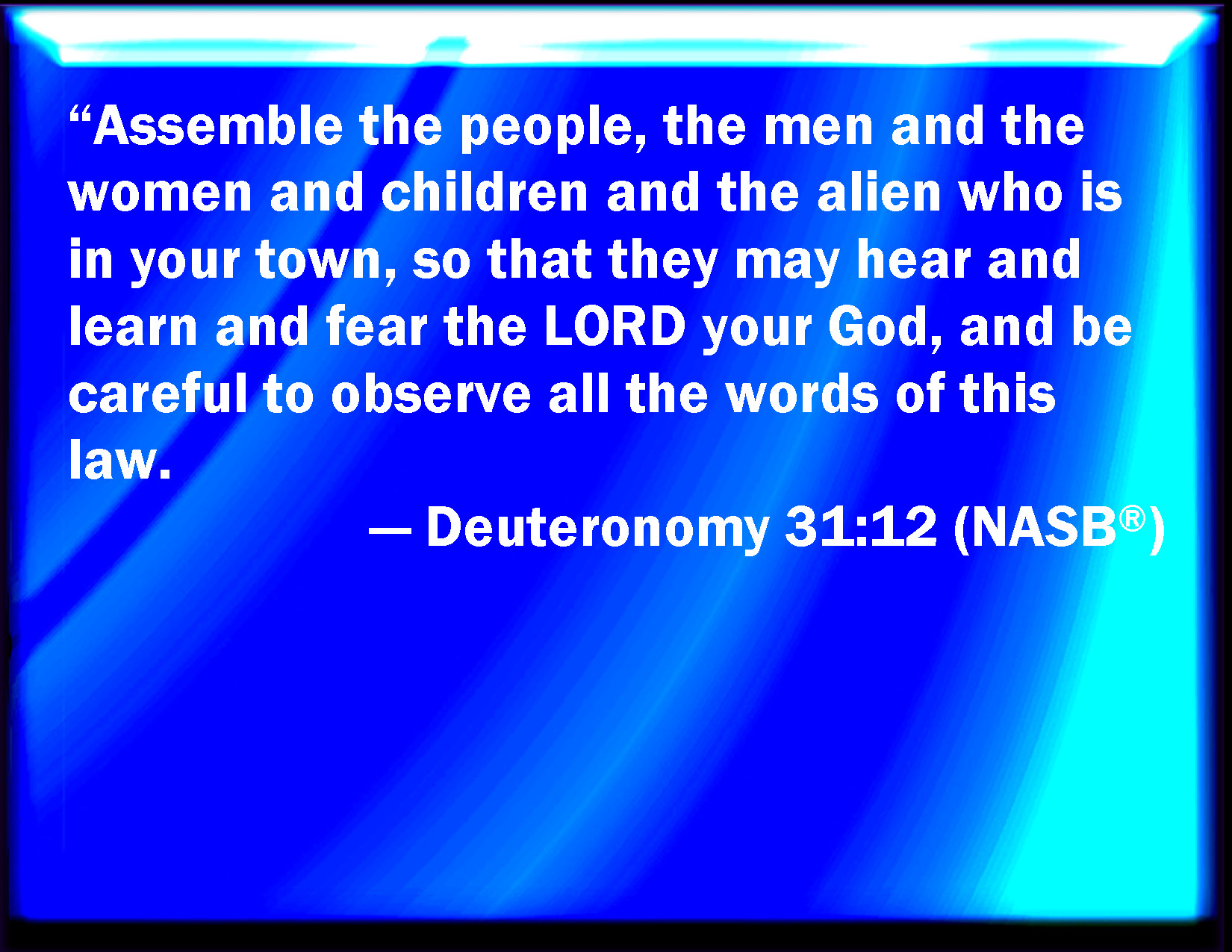Bible Verse Slide Deuteronomy 31:12 Gather the people together, men and women, and children, and your stranger that is within your gates, that they may hear, and that they may learn, and fear the LORD your God, and observe to do all the words of this law: KJV: Gather the people together, men, and women, and children, and thy stranger that is within thy gates, that they may hear, and that they may learn, and fear the LORD your God, and observe to do all the words of this law: DRB: And the people being all assembled together, both men and women, children and strangers, that are within thy gates: that hearing they may learn, and fear the Lord your God, and keep, and fulfil all the words of this law: DBT: Gather the people together, the men, and the women, and the children, and thy stranger that is within thy gates, that they may hear, and that they may learn, and fear Jehovah your God, and take heed to do all the words of this law; ERV: Assemble the people, the men and the women and the little ones, and thy stranger that is within thy gates, that they may hear, and that they may learn, and fear the LORD your God, and observe to do all the words of this law; WBT: Convene the people, men, and women, and children, and thy stranger that is within thy gates, that they may hear, and that they may learn, and fear the LORD your God, and observe to do all the words of this law: WEB: Assemble the people, the men and the women and the little ones, and your foreigner who is within your gates, that they may hear, and that they may learn, and fear Yahweh your God, and observe to do all the words of this law; YLT: Assemble the people, the men, and the women, and the infants, and thy sojourner who is within thy gates, so that they hear, and so that they learn, and have feared Jehovah your God, and observed to do all the words of this law;Links Deuteronomy 31:12 NIV • Deuteronomy 31:12 NLT • Deuteronomy 31:12 ESV • Deuteronomy 31:12 NASB • Deuteronomy 31:12 KJV • Deuteronomy 31:12 Interlinear • Deuteronomy 31:12 Commentaries • Deuteronomy 31:12 Parallel Texts • Deuteronomy 31:12 Bible Apps • Deuteronomy 31:12 Parallel • Bible Hub |