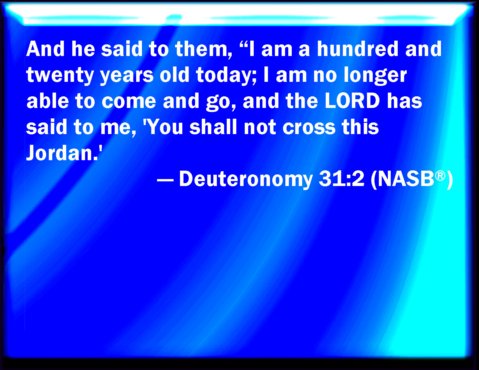 Bible Verse Slide Deuteronomy 31:2 And he said to them, I am an hundred and twenty years old this day; I can no more go out and come in: also the LORD has said to me, You shall not go over this Jordan. KJV: And he said unto them, I am an hundred and twenty years old this day; I can no more go out and come in: also the LORD hath said unto me, Thou shalt not go over this Jordan. DRB: And he said to them: I am this day a hundred and twenty years old, I can no longer go out and come in, especially as the Lord also hath said to me: Thou shalt not pass over this Jordan. DBT: and he said unto them, I am a hundred and twenty years old this day, I can no more go out and come in; and Jehovah hath said unto me, Thou shalt not go over this Jordan. ERV: And he said unto them, I am an hundred and twenty years old this day; I can no more go out and come in: and the LORD hath said unto me, Thou shalt not go over this Jordan. WBT: And he said to them, I am a hundred and twenty years old this day; I can no more go out and come in: also the LORD hath said to me, thou shalt not go over this Jordan. WEB: He said to them, "I am one hundred twenty years old this day; I can no more go out and come in: and Yahweh has said to me, 'You shall not go over this Jordan.' YLT: and he saith unto them, 'A son of a hundred and twenty years am I to-day; I am not able any more to go out and to come in, and Jehovah hath said unto me, Thou dost not pass over this Jordan,Links Deuteronomy 31:2 NIV • Deuteronomy 31:2 NLT • Deuteronomy 31:2 ESV • Deuteronomy 31:2 NASB • Deuteronomy 31:2 KJV • Deuteronomy 31:2 Interlinear • Deuteronomy 31:2 Commentaries • Deuteronomy 31:2 Parallel Texts • Deuteronomy 31:2 Bible Apps • Deuteronomy 31:2 Parallel • Bible Hub |