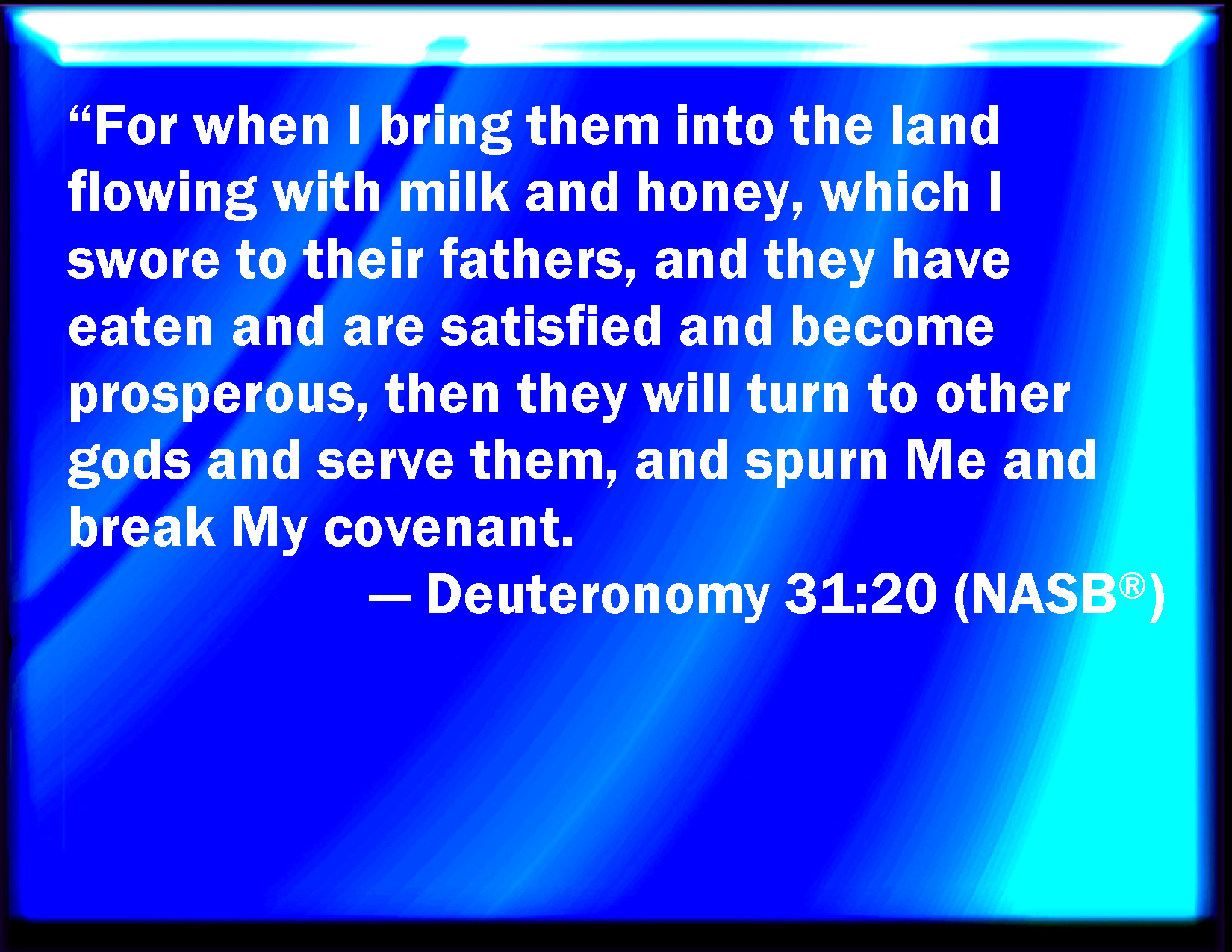 Bible Verse Slide Deuteronomy 31:20 For when I shall have brought them into the land which I swore to their fathers, that flows with milk and honey; and they shall have eaten and filled themselves, and waxen fat; then will they turn to other gods, and serve them, and provoke me, and break my covenant. KJV: For when I shall have brought them into the land which I sware unto their fathers, that floweth with milk and honey; and they shall have eaten and filled themselves, and waxen fat; then will they turn unto other gods, and serve them, and provoke me, and break my covenant. DRB: For I will bring them into the land, for which I swore to their fathers, that floweth with milk and honey. And when they have eaten, and are full and fat, they will turn away after strange gods, and will serve them: and will despise me, and make void my covenant. DBT: For I shall bring them into the land which I swore unto their fathers, which floweth with milk and honey; and they will eat and fill themselves, and wax fat, and will turn unto other gods, and serve them, and despise me, and break my covenant. ERV: For when I shall have brought them into the land which I sware unto their fathers, flowing with milk and honey; and they shall have eaten and filled themselves, and waxen fat; then will they turn unto other gods, and serve them, and despise me, and break my covenant. WBT: For when I shall have brought them into the land which I swore to their fathers, that floweth with milk and honey; and they shall have eaten and filled themselves, and waxed fat; then will they turn to other gods, and serve them, and provoke me, and break my covenant. WEB: For when I shall have brought them into the land which I swore to their fathers, flowing with milk and honey, and they shall have eaten and filled themselves, and grown fat; then will they turn to other gods, and serve them, and despise me, and break my covenant. YLT: and I bring them in unto the ground which I have sworn to their fathers — flowing with milk and honey, and they have eaten, and been satisfied, and been fat, and have turned unto other gods, and they have served them, and despised Me, and broken My covenant.Links Deuteronomy 31:20 NIV • Deuteronomy 31:20 NLT • Deuteronomy 31:20 ESV • Deuteronomy 31:20 NASB • Deuteronomy 31:20 KJV • Deuteronomy 31:20 Interlinear • Deuteronomy 31:20 Commentaries • Deuteronomy 31:20 Parallel Texts • Deuteronomy 31:20 Bible Apps • Deuteronomy 31:20 Parallel • Bible Hub |