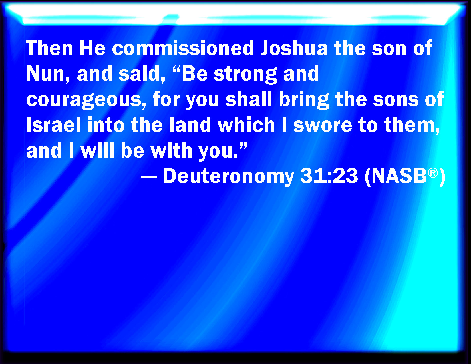 Bible Verse Slide Deuteronomy 31:23 And he gave Joshua the son of Nun a charge, and said, Be strong and of a good courage: for you shall bring the children of Israel into the land which I swore to them: and I will be with you. KJV: And he gave Joshua the son of Nun a charge, and said, Be strong and of a good courage: for thou shalt bring the children of Israel into the land which I sware unto them: and I will be with thee. DRB: And the Lord commanded Josue the son of Nun, and said: Take courage, and be valiant: for thou shalt bring the children of Israel into the land which I have promised, and I will be with thee. DBT: And Jehovah commanded Joshua the son of Nun, and said, Be strong and courageous; for thou shalt bring the children of Israel into the land which I have sworn unto them; and I will be with thee. ERV: And he gave Joshua the son of Nun a charge, and said, Be strong and of a good courage: for thou shalt bring the children of Israel into the land which I sware unto them: and I will be with thee. WBT: And he gave Joshua the son of Nun a charge, and said, Be strong and of a good courage: for thou shalt bring the children of Israel into the land which I swore to them: and I will be with thee. WEB: He commissioned Joshua the son of Nun, and said, "Be strong and courageous; for you shall bring the children of Israel into the land which I swore to them: and I will be with you." YLT: and He commandeth Joshua son of Nun, and saith, 'Be strong and courageous, for thou dost bring in the sons of Israel unto the land which I have sworn to them, and I — I am with thee.'Links Deuteronomy 31:23 NIV • Deuteronomy 31:23 NLT • Deuteronomy 31:23 ESV • Deuteronomy 31:23 NASB • Deuteronomy 31:23 KJV • Deuteronomy 31:23 Interlinear • Deuteronomy 31:23 Commentaries • Deuteronomy 31:23 Parallel Texts • Deuteronomy 31:23 Bible Apps • Deuteronomy 31:23 Parallel • Bible Hub |