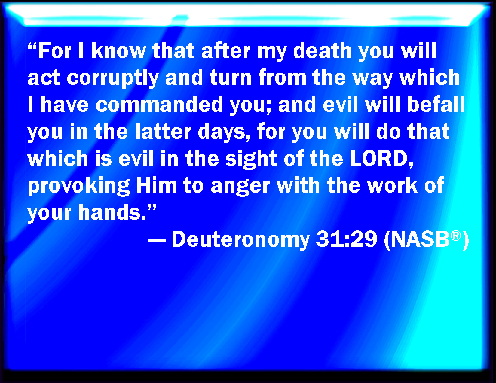 Deuteronomy 31:29 For I know that after my death you will utterly corrupt yourselves, and turn aside from the way which I have commanded you; and evil will befall you in the latter days; because you will do evil in the sight of the LORD, to provoke him to anger through the work of your hands.