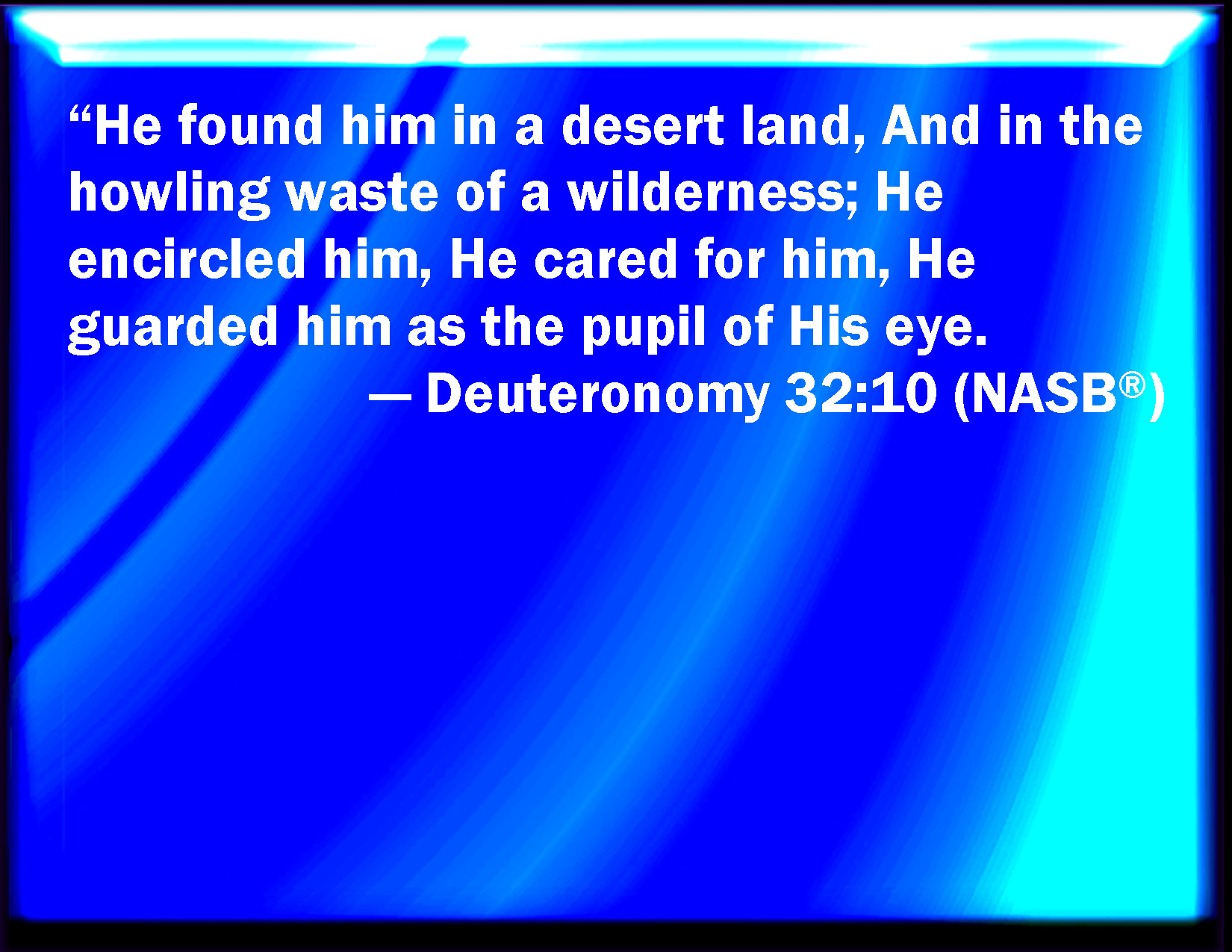 Bible Verse Slide Deuteronomy 32:10 He found him in a desert land, and in the waste howling wilderness; he led him about, he instructed him, he kept him as the apple of his eye. KJV: He found him in a desert land, and in the waste howling wilderness; he led him about, he instructed him, he kept him as the apple of his eye. DRB: He found him in a desert land, in a place of horror, and of vast wilderness: he led him about, and taught him: and he kept him as the apple of his eye. DBT: He found him in a desert land, And in the waste, howling wilderness; He compassed him about, he watched over him, He preserved him as the apple of his eye. ERV: He found him in a desert land, And in the waste howling wilderness; He compassed him about, he cared for him, He kept him as the apple of his eye: WBT: He found him in a desert land, and in the waste howling wilderness; he led him about, he instructed him, he kept him as the apple of his eye. WEB: He found him in a desert land, in the waste howling wilderness. He surrounded him. He cared for him. He kept him as the apple of his eye. YLT: He findeth him in a land — a desert, And in a void — a howling wilderness, He turneth him round — He causeth him to understand — He keepeth him as the apple of His eye.Links Deuteronomy 32:10 NIV • Deuteronomy 32:10 NLT • Deuteronomy 32:10 ESV • Deuteronomy 32:10 NASB • Deuteronomy 32:10 KJV • Deuteronomy 32:10 Interlinear • Deuteronomy 32:10 Commentaries • Deuteronomy 32:10 Parallel Texts • Deuteronomy 32:10 Bible Apps • Deuteronomy 32:10 Parallel • Bible Hub |