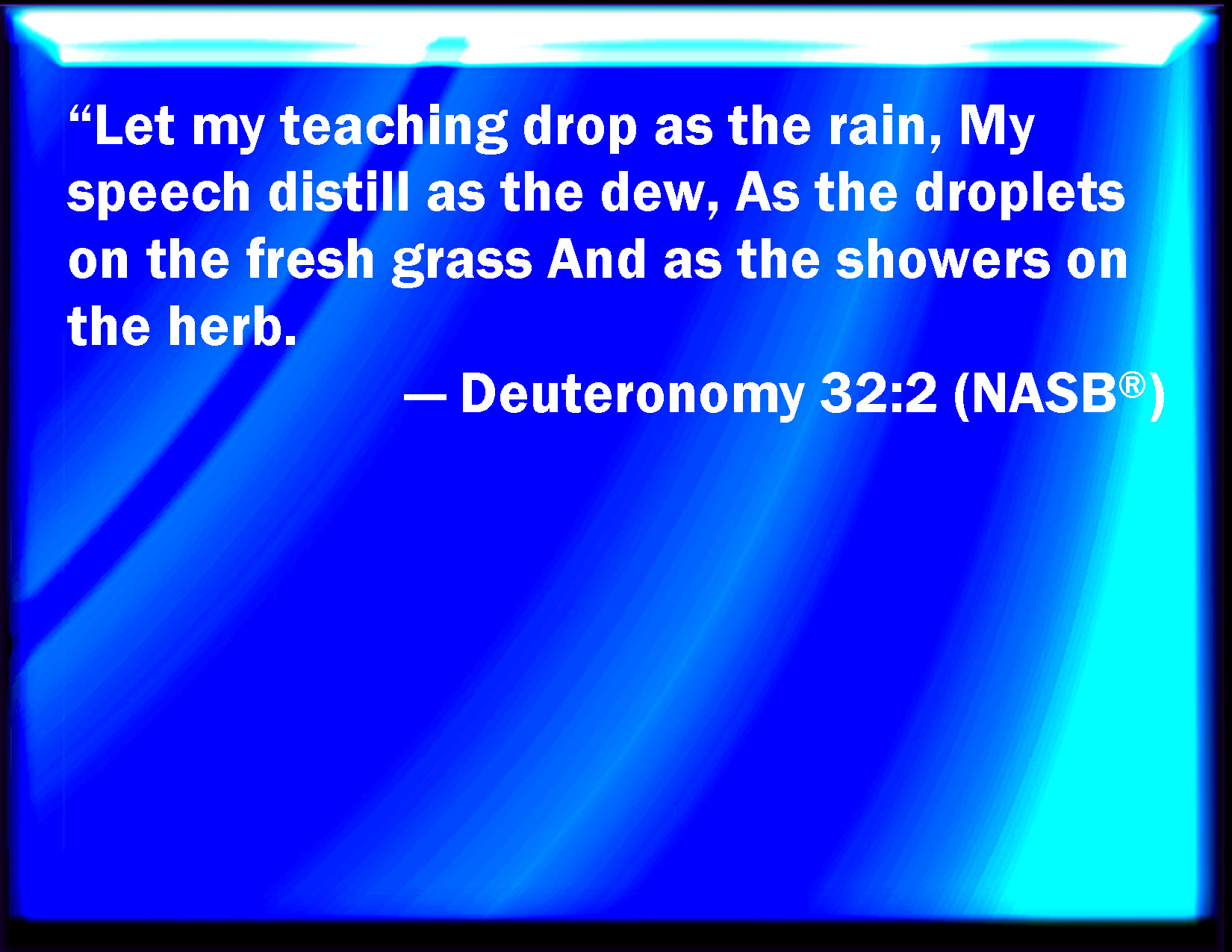 Bible Verse Slide Deuteronomy 32:2 My doctrine shall drop as the rain, my speech shall distil as the dew, as the small rain on the tender herb, and as the showers on the grass: KJV: My doctrine shall drop as the rain, my speech shall distil as the dew, as the small rain upon the tender herb, and as the showers upon the grass: DRB: Let my doctrine gather as the rain, let my speech distil as the dew, as a shower upon the herb, and as drops upon the grass. DBT: My doctrine shall drop as rain, My speech flow down as dew, As small rain upon the tender herb, And as showers on the grass. ERV: My doctrine shall drop as the rain, My speech shall distil as the dew; As the small rain upon the tender grass, And as the showers upon the herb: WBT: My doctrine shall drop as the rain, my speech shall distill as the dew, as the small rain upon the tender herb, and as the showers upon the grass: WEB: My doctrine shall drop as the rain. My speech shall condense as the dew, as the small rain on the tender grass, as the showers on the herb. YLT: Drop as rain doth My doctrine; Flow as dew doth My sayings; As storms on the tender grass, And as showers on the herb,Links Deuteronomy 32:2 NIV • Deuteronomy 32:2 NLT • Deuteronomy 32:2 ESV • Deuteronomy 32:2 NASB • Deuteronomy 32:2 KJV • Deuteronomy 32:2 Interlinear • Deuteronomy 32:2 Commentaries • Deuteronomy 32:2 Parallel Texts • Deuteronomy 32:2 Bible Apps • Deuteronomy 32:2 Parallel • Bible Hub |