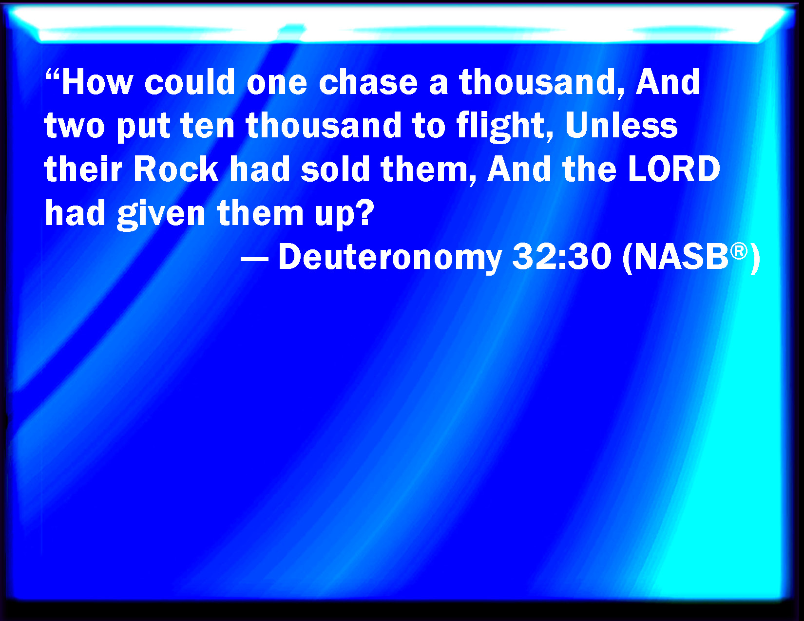 Bible Verse Slide Deuteronomy 32:30 How should one chase a thousand, and two put ten thousand to flight, except their Rock had sold them, and the LORD had shut them up? KJV: How should one chase a thousand, and two put ten thousand to flight, except their Rock had sold them, and the LORD had shut them up? DRB: How should one pursue after a thousand, and two chase ten thousand? Was it not, because their God had sold them, and the Lord had shut them up? DBT: How could one chase a thousand, And two put ten thousand to flight, Were it not that their Rock had sold them, And Jehovah had delivered them up? ERV: How should one chase a thousand, And two put ten thousand to flight, Except their Rock had sold them, And the LORD had delivered them up? WBT: How should one chase a thousand, and two put ten thousand to flight, except their Rock had sold them, and the LORD had shut them up? WEB: How could one chase a thousand, and two put ten thousand to flight, unless their Rock had sold them, and Yahweh had delivered them up? YLT: How doth one pursue a thousand, And two cause a myriad to flee! If not — that their rock hath sold them, And Jehovah hath shut them up?Links Deuteronomy 32:30 NIV • Deuteronomy 32:30 NLT • Deuteronomy 32:30 ESV • Deuteronomy 32:30 NASB • Deuteronomy 32:30 KJV • Deuteronomy 32:30 Interlinear • Deuteronomy 32:30 Commentaries • Deuteronomy 32:30 Parallel Texts • Deuteronomy 32:30 Bible Apps • Deuteronomy 32:30 Parallel • Bible Hub |