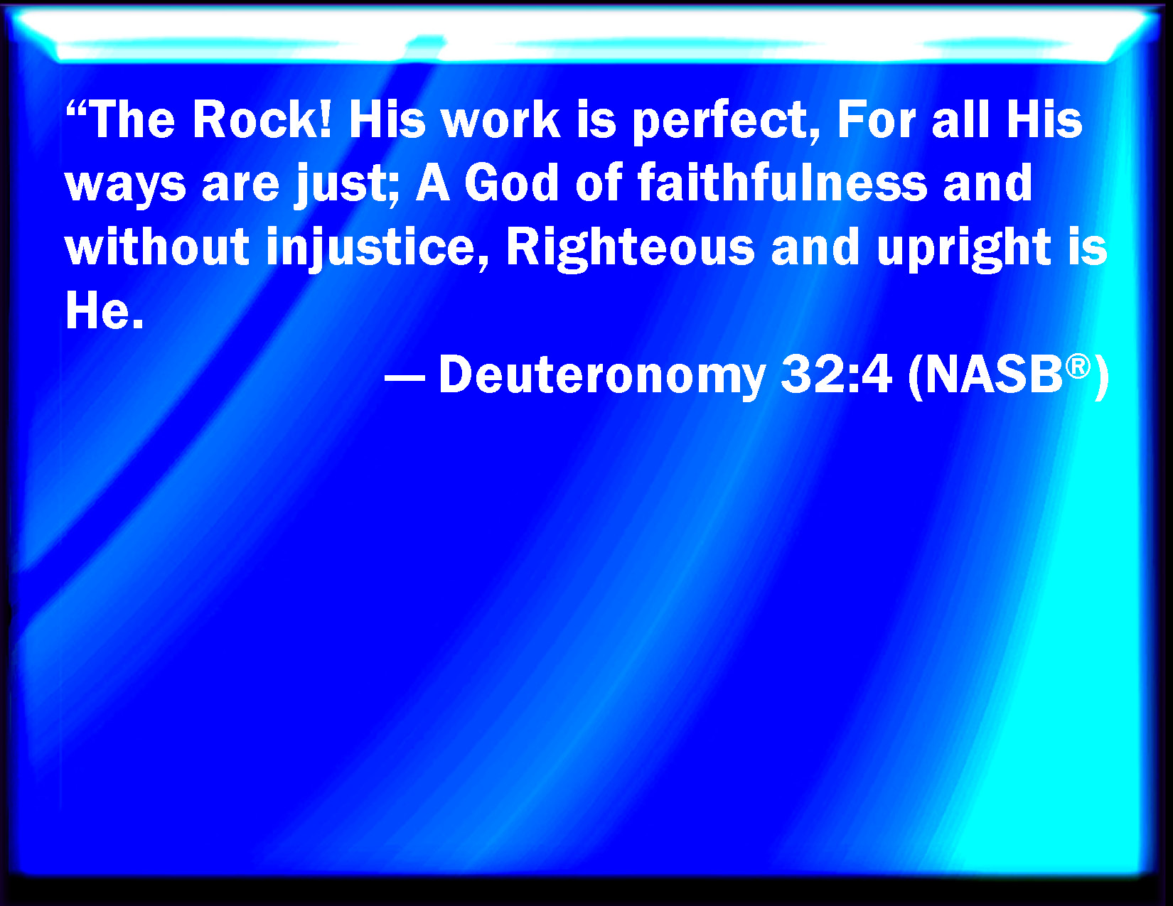 Bible Verse Slide Deuteronomy 32:4 He is the Rock, his work is perfect: for all his ways are judgment: a God of truth and without iniquity, just and right is he. KJV: He is the Rock, his work is perfect: for all his ways are judgment: a God of truth and without iniquity, just and right is he. DRB: The works of God are perfect, and all his ways are judgments: God is faithful and without any iniquity, he is just and right. DBT: He is the Rock, his work is perfect, For all his ways are righteousness; A God of faithfulness without deceit, Just and right is he. ERV: The Rock, his work is perfect; For all his ways are judgment: A God of faithfulness and without iniquity, Just and right is he. WBT: He is the Rock, his work is perfect: for all his ways are judgment: a God of truth and without iniquity: just and right is he. WEB: The Rock, his work is perfect, for all his ways are justice: a God of faithfulness and without iniquity, just and right is he. YLT: The Rock! — perfect is His work, For all His ways are just; God of stedfastness, and without iniquity: Righteous and upright is He.Links Deuteronomy 32:4 NIV • Deuteronomy 32:4 NLT • Deuteronomy 32:4 ESV • Deuteronomy 32:4 NASB • Deuteronomy 32:4 KJV • Deuteronomy 32:4 Interlinear • Deuteronomy 32:4 Commentaries • Deuteronomy 32:4 Parallel Texts • Deuteronomy 32:4 Bible Apps • Deuteronomy 32:4 Parallel • Bible Hub |
