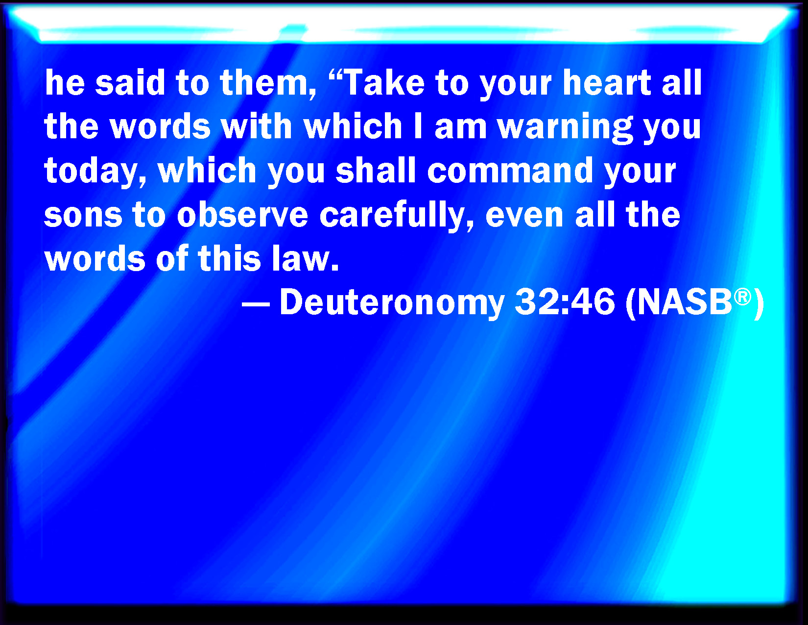 Bible Verse Slide Deuteronomy 32:46 And he said to them, Set your hearts to all the words which I testify among you this day, which you shall command your children to observe to do, all the words of this law. KJV: And he said unto them, Set your hearts unto all the words which I testify among you this day, which ye shall command your children to observe to do, all the words of this law. DRB: And he said to them : Set your hearts on all the words, which I testify to you this day: which you shall command your children to observe and to do, and to fulfil all that is written in this law: DBT: he said unto them, Set your hearts unto all the words that I testify among you this day, which ye shall command your children to take heed to do, all the words of this law. ERV: And he said unto them, Set your heart unto all the words which I testify unto you this day; which ye shall command your children, to observe to do all the words of this law. WBT: And he said to them, Set your hearts to all the words which I testify among you this day, which ye shall command your children to observe to do, all the words of this law. WEB: He said to them, "Set your heart to all the words which I testify to you this day, which you shall command your children to observe to do, [even] all the words of this law. YLT: and saith unto them, 'Set your heart to all the words which I am testifying against you to-day, that ye command your sons to observe to do all the words of this law,Links Deuteronomy 32:46 NIV • Deuteronomy 32:46 NLT • Deuteronomy 32:46 ESV • Deuteronomy 32:46 NASB • Deuteronomy 32:46 KJV • Deuteronomy 32:46 Interlinear • Deuteronomy 32:46 Commentaries • Deuteronomy 32:46 Parallel Texts • Deuteronomy 32:46 Bible Apps • Deuteronomy 32:46 Parallel • Bible Hub |