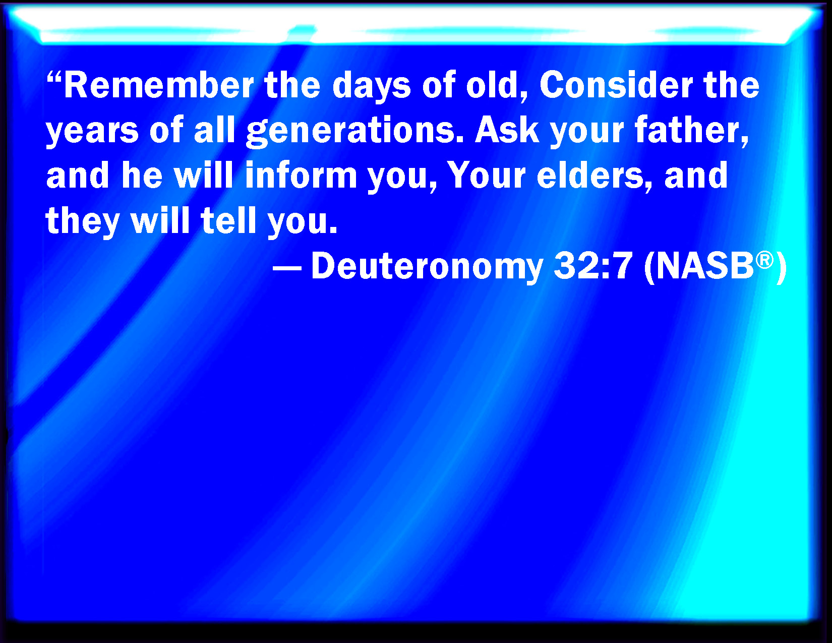 Bible Verse Slide Deuteronomy 32:7 Remember the days of old, consider the years of many generations: ask your father, and he will show you; your elders, and they will tell you. KJV: Remember the days of old, consider the years of many generations: ask thy father, and he will shew thee; thy elders, and they will tell thee. DRB: Remember the days of old, think upon every generation: ask thy father, and he will declare to thee: thy elders and they will tell thee. DBT: Remember the days of old, Consider the years of generation to generation; Ask thy father, and he will shew thee; Thine elders, and they will tell thee. ERV: Remember the days of old, Consider the years of many generations: Ask thy father, and he will shew thee; Thine elders, and they will tell thee. WBT: Remember the days of old, consider the years of many generations: ask thy father, and he will show thee; thy elders, and they will tell thee. WEB: Remember the days of old. Consider the years of many generations. Ask your father, and he will show you; your elders, and they will tell you. YLT: Remember days of old — Understand the years of many generations — Ask thy father, and he doth tell thee; Thine elders, and they say to thee:Links Deuteronomy 32:7 NIV • Deuteronomy 32:7 NLT • Deuteronomy 32:7 ESV • Deuteronomy 32:7 NASB • Deuteronomy 32:7 KJV • Deuteronomy 32:7 Interlinear • Deuteronomy 32:7 Commentaries • Deuteronomy 32:7 Parallel Texts • Deuteronomy 32:7 Bible Apps • Deuteronomy 32:7 Parallel • Bible Hub |