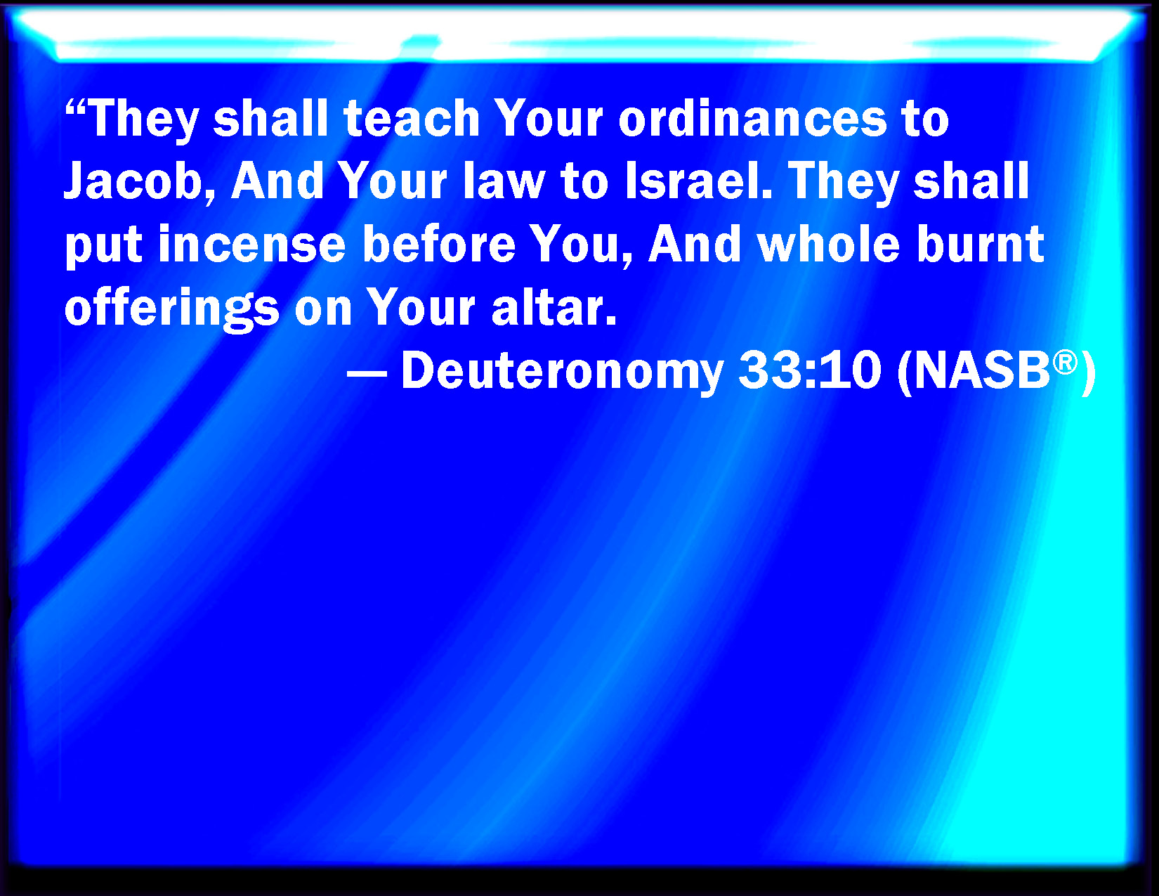 Bible Verse Slide Deuteronomy 33:10 They shall teach Jacob your judgments, and Israel your law: they shall put incense before you, and whole burnt sacrifice on your altar. KJV: They shall teach Jacob thy judgments, and Israel thy law: they shall put incense before thee, and whole burnt sacrifice upon thine altar. DRB: Thy judgments, O Jacob, and thy law, O Israel: they shall put incense in thy wrath and holocaust upon thy altar. DBT: They shall teach Jacob thine ordinances, And Israel thy law: They shall put incense before thy nostrils, And whole burnt-offering upon thine altar. ERV: They shall teach Jacob thy judgments, And Israel thy law: They shall put incense before thee, And whole burnt offering upon thine altar. WBT: They shall teach Jacob thy judgments, and Israel thy law; they shall put incense before thee, and whole burnt sacrifice upon thy altar. WEB: They shall teach Jacob your ordinances, and Israel your law. They shall put incense before you, and whole burnt offering on your altar. YLT: They teach Thy judgments to Jacob, And Thy law to Israel; They put perfume in Thy nose, And whole burnt-offering on Thine altar.Links Deuteronomy 33:10 NIV • Deuteronomy 33:10 NLT • Deuteronomy 33:10 ESV • Deuteronomy 33:10 NASB • Deuteronomy 33:10 KJV • Deuteronomy 33:10 Interlinear • Deuteronomy 33:10 Commentaries • Deuteronomy 33:10 Parallel Texts • Deuteronomy 33:10 Bible Apps • Deuteronomy 33:10 Parallel • Bible Hub |