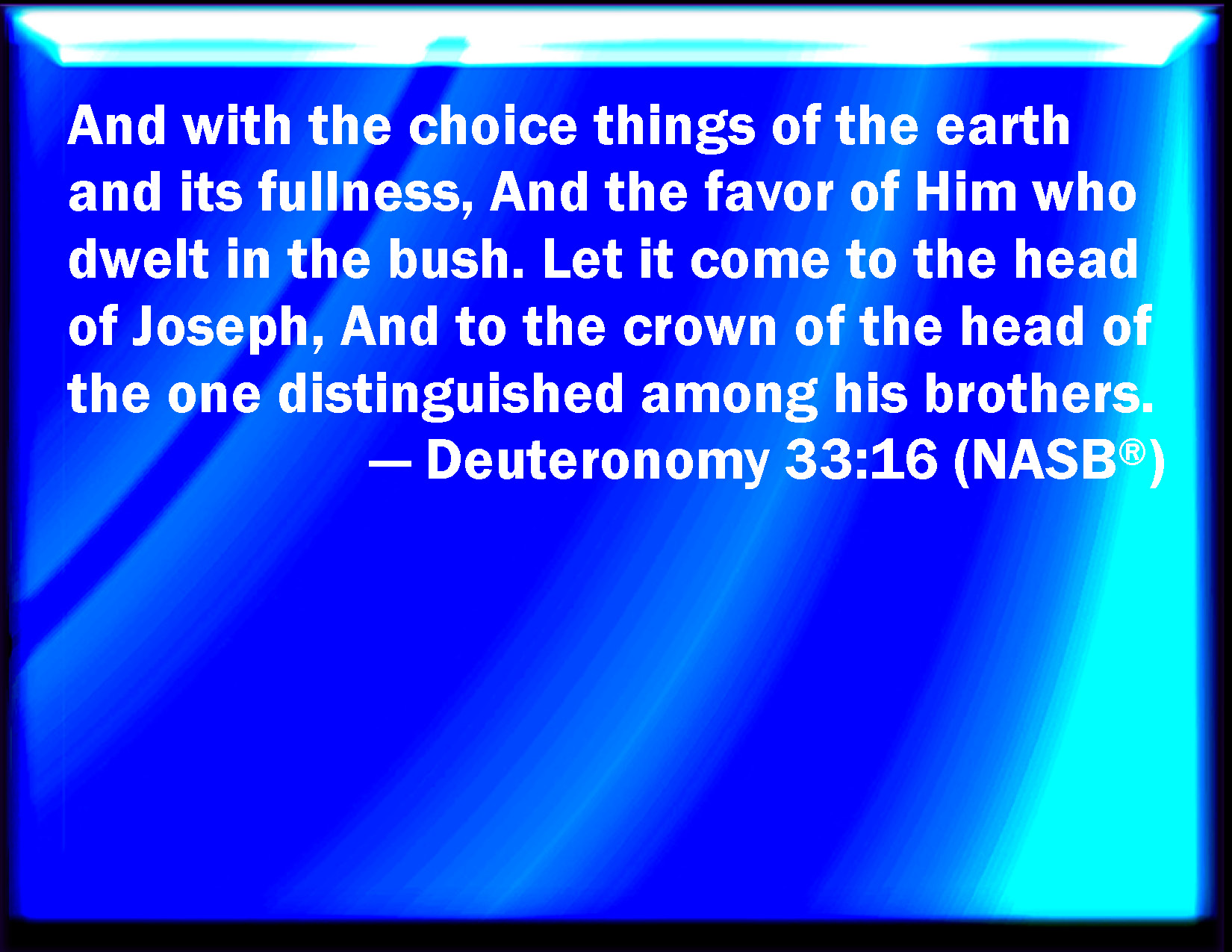 Bible Verse Slide Deuteronomy 33:16 And for the precious things of the earth and fullness thereof, and for the good will of him that dwelled in the bush: let the blessing come on the head of Joseph, and on the top of the head of him that was separated from his brothers. KJV: And for the precious things of the earth and fulness thereof, and for the good will of him that dwelt in the bush: let the blessing come upon the head of Joseph, and upon the top of the head of him that was separated from his brethren. DRB: And of the fruits of the earth, and of the fulness thereof. The blessing of him that appeared in the bush, come upon the head of Joseph, and upon the crown of the Nazarite among his brethren. DBT: And by the precious things of the earth and the fulness thereof. And let the good will of him that dwelt in the bush Come upon the head of Joseph, Upon the top of the head of him that was separated from his brethren. ERV: And for the precious things of the earth and the fulness thereof, And the good will of him that dwelt in the bush: Let the blessing come upon the head of Joseph, And upon the crown of the head of him that was separate from his brethren. WBT: And for the precious things of the earth and fullness of it, and for the good will of him that dwelt in the bush; let the blessing come upon the head of Joseph, and upon the top of the head of him that was separated from his brethren. WEB: for the precious things of the earth and its fullness, the good will of him who lived in the bush. Let [the blessing] come on the head of Joseph, On the crown of the head of him who was separate from his brothers. YLT: And by precious things — of earth and its fulness, And the good pleasure Of Him who is dwelling in the bush, — Let it come for the head of Joseph, And for the crown of him Who is separate from his brethren.Links Deuteronomy 33:16 NIV • Deuteronomy 33:16 NLT • Deuteronomy 33:16 ESV • Deuteronomy 33:16 NASB • Deuteronomy 33:16 KJV • Deuteronomy 33:16 Interlinear • Deuteronomy 33:16 Commentaries • Deuteronomy 33:16 Parallel Texts • Deuteronomy 33:16 Bible Apps • Deuteronomy 33:16 Parallel • Bible Hub |