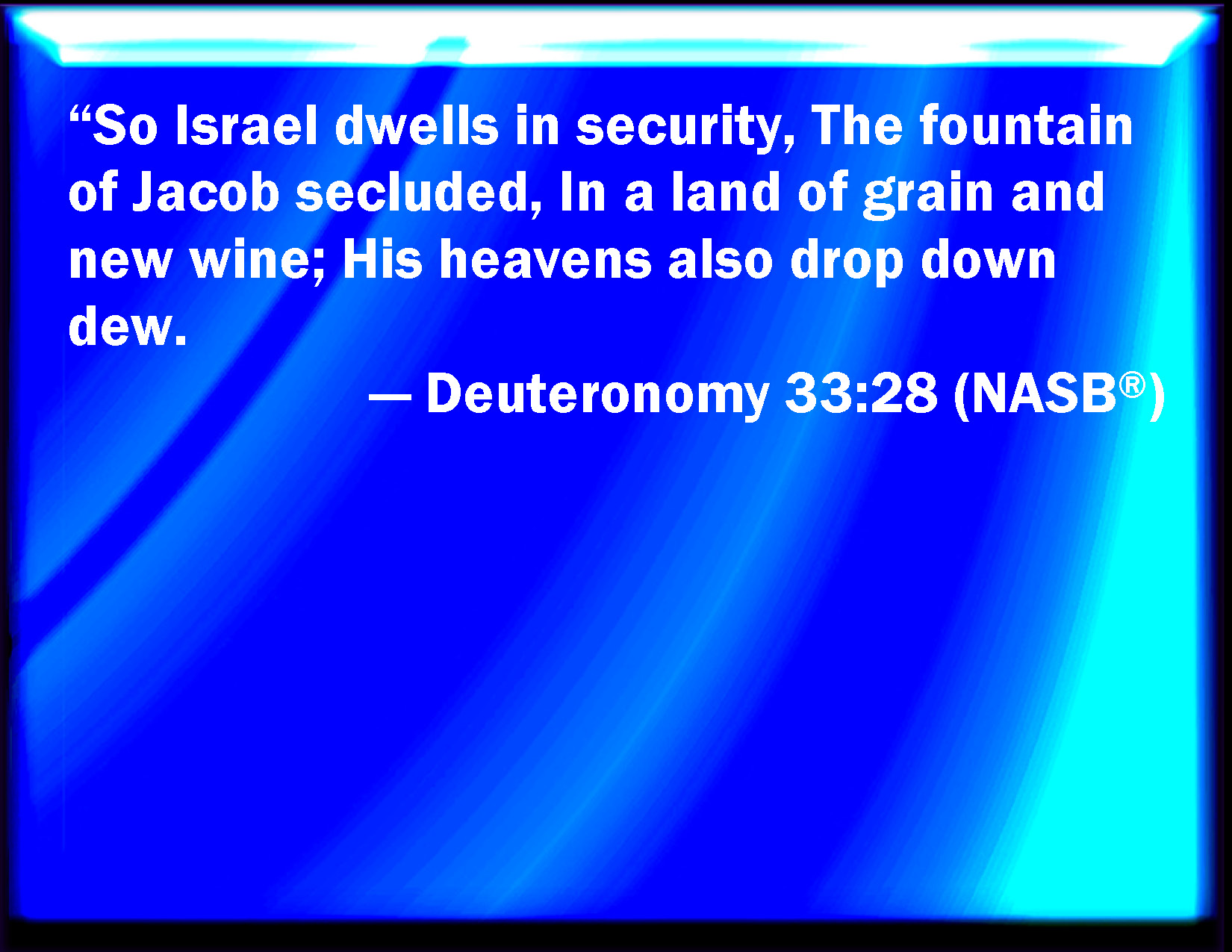 Bible Verse Slide Deuteronomy 33:28 Israel then shall dwell in safety alone: the fountain of Jacob shall be on a land of corn and wine; also his heavens shall drop down dew. KJV: Israel then shall dwell in safety alone: the fountain of Jacob shall be upon a land of corn and wine; also his heavens shall drop down dew. DRB: Israel shall dwell in safety, and alone. The eye of Jacob in a land of corn and wine, and the heavens shall be misty with dew. DBT: And Israel shall dwell in safety alone, The fountain of Jacob, in a land of corn and new wine; Also his heavens shall drop down dew. ERV: And Israel dwelleth in safety, The fountain of Jacob alone, In a land of corn and wine; Yea, his heavens drop down dew. WBT: Israel then shall dwell in safety alone; the fountain of Jacob shall be upon a land of corn and wine, also his heavens shall drop down dew. WEB: Israel dwells in safety; the fountain of Jacob alone, In a land of grain and new wine. Yes, his heavens drop down dew. YLT: And Israel doth tabernacle in confidence alone; The eye of Jacob is unto a land of corn and wine; Also His heavens drop down dew.Links Deuteronomy 33:28 NIV • Deuteronomy 33:28 NLT • Deuteronomy 33:28 ESV • Deuteronomy 33:28 NASB • Deuteronomy 33:28 KJV • Deuteronomy 33:28 Interlinear • Deuteronomy 33:28 Commentaries • Deuteronomy 33:28 Parallel Texts • Deuteronomy 33:28 Bible Apps • Deuteronomy 33:28 Parallel • Bible Hub |