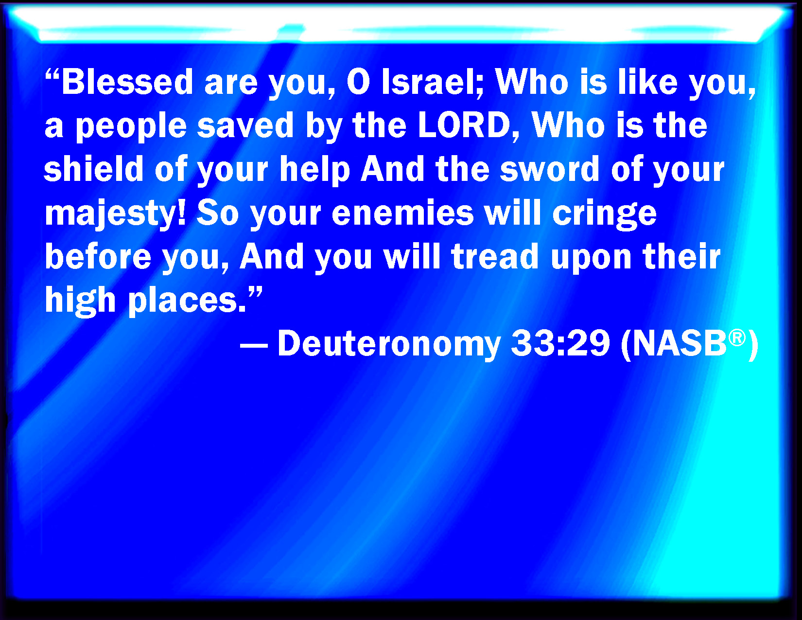 Bible Verse Slide Deuteronomy 33:29 Happy are you, O Israel: who is like to you, O people saved by the LORD, the shield of your help, and who is the sword of your excellency! and your enemies shall be found liars to you; and you shall tread on their high places. KJV: Happy art thou, O Israel: who is like unto thee, O people saved by the LORD, the shield of thy help, and who is the sword of thy excellency! and thine enemies shall be found liars unto thee; and thou shalt tread upon their high places. DRB: Blessed are thou, Israel: who is like to thee, O people, that art saved by the Lord? the shield of thy help, and the sword of thy glory: thy enemies shall deny thee, and thou shalt tread upon their necks. DBT: Happy art thou, Israel! Who is like unto thee, a people saved by Jehovah, The shield of thy help, And the sword of thine excellency? And thine enemies shall come cringing to thee; And thou shalt tread upon their high places. ERV: Happy art thou, O Israel: Who is like unto thee, a people saved by the LORD, The shield of thy help, And that is the sword of thy excellency! And thine enemies shall submit themselves unto thee; And thou shalt tread upon their high places. WBT: Happy art thou, O Israel: who is like to thee, O people saved by the LORD, the shield of thy help, and who is the sword of thy excellence! and thy enemies shall be found liars to thee; and thou shalt tread upon their high places. WEB: You are happy, Israel. Who is like you, a people saved by Yahweh, the shield of your help, the sword of your excellency! Your enemies shall submit themselves to you. You shall tread on their high places." YLT: O thy happiness, O Israel! who is like thee? A people saved by Jehovah, The shield of thy help, And He who is the sword of thine excellency: And thine enemies are subdued for thee, And thou on their high places dost tread.'Links Deuteronomy 33:29 NIV • Deuteronomy 33:29 NLT • Deuteronomy 33:29 ESV • Deuteronomy 33:29 NASB • Deuteronomy 33:29 KJV • Deuteronomy 33:29 Interlinear • Deuteronomy 33:29 Commentaries • Deuteronomy 33:29 Parallel Texts • Deuteronomy 33:29 Bible Apps • Deuteronomy 33:29 Parallel • Bible Hub |