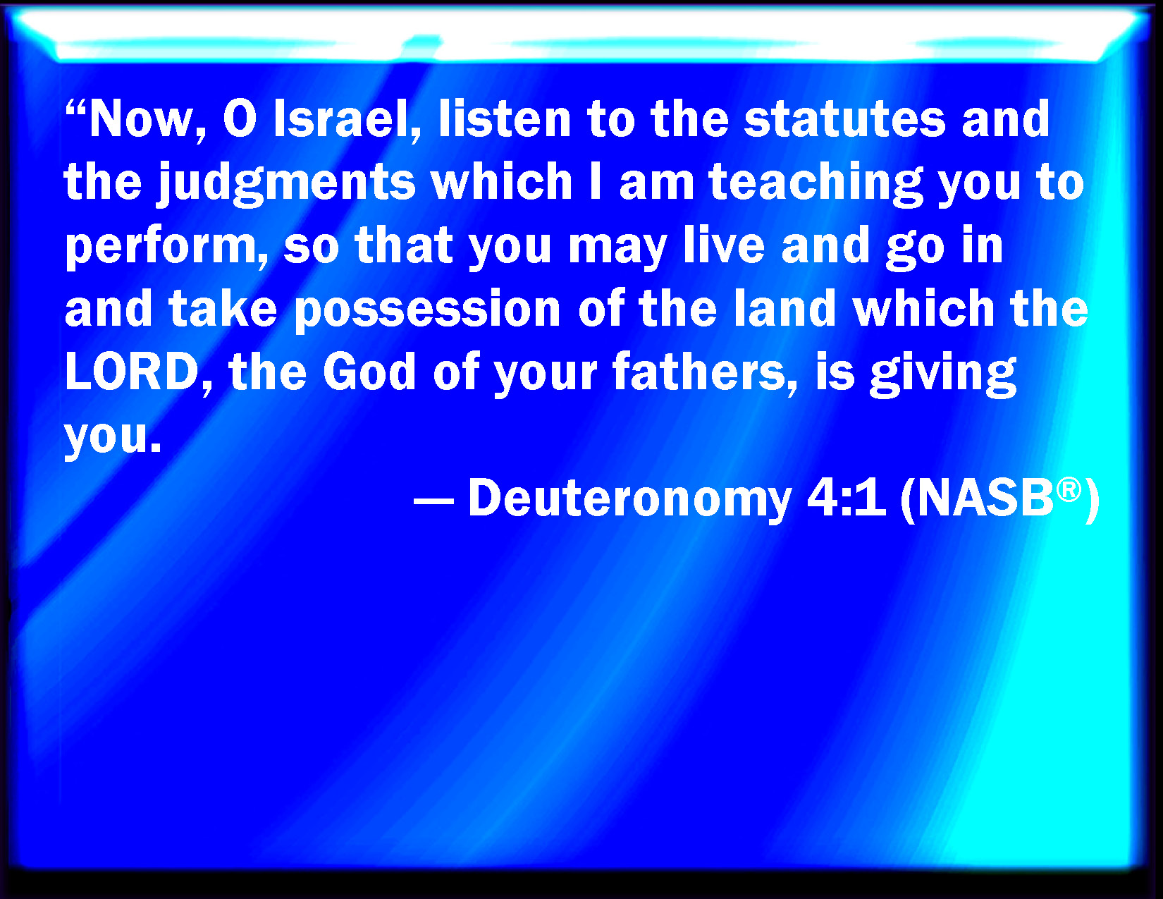 Bible Verse Slide Deuteronomy 4:1 Now therefore listen, O Israel, to the statutes and to the judgments, which I teach you, for to do them, that you may live, and go in and possess the land which the LORD God of your fathers gives you. KJV: Now therefore hearken, O Israel, unto the statutes and unto the judgments, which I teach you, for to do them, that ye may live, and go in and possess the land which the LORD God of your fathers giveth you. DRB: And now, O Israel, hear the commandments and judgments which I teach thee: that doing them, thou mayst live, and entering in mayst possess the land which the Lord the God of your fathers will give you. DBT: And now, Israel, hearken to the statutes and to the ordinances which I teach you, to do them, that ye may live, and go in and possess the land which Jehovah the God of your fathers giveth you. ERV: And now, O Israel, hearken unto the statutes and unto the judgments, which I teach you, for to do them; that ye may live, and go in and possess the land which the LORD, the God of your fathers, giveth you. WBT: Now therefore hearken, O Israel, to the statutes and to the judgments, which I teach you, to do them, that ye may live, and go in and possess the land which the LORD God of your fathers giveth you. WEB: Now, Israel, listen to the statutes and to the ordinances, which I teach you, to do them; that you may live, and go in and possess the land which Yahweh, the God of your fathers, gives you. YLT: 'And now, Israel, hearken unto the statutes, and unto the judgments which I am teaching you to do, so that ye live, and have gone in, and possessed the land which Jehovah God of your fathers is giving to you.Links Deuteronomy 4:1 NIV • Deuteronomy 4:1 NLT • Deuteronomy 4:1 ESV • Deuteronomy 4:1 NASB • Deuteronomy 4:1 KJV • Deuteronomy 4:1 Interlinear • Deuteronomy 4:1 Commentaries • Deuteronomy 4:1 Parallel Texts • Deuteronomy 4:1 Bible Apps • Deuteronomy 4:1 Parallel • Bible Hub |