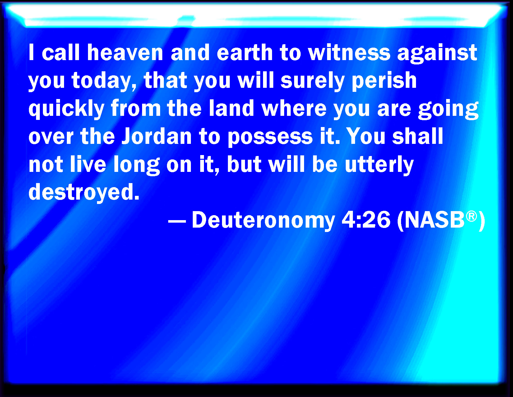 Bible Verse Slide Deuteronomy 4:26 I call heaven and earth to witness against you this day, that you shall soon utterly perish from off the land whereunto you go over Jordan to possess it; you shall not prolong your days on it, but shall utterly be destroyed. KJV: I call heaven and earth to witness against you this day, that ye shall soon utterly perish from off the land whereunto ye go over Jordan to possess it; ye shall not prolong your days upon it, but shall utterly be destroyed. DRB: I call this day heaven and earth to witness, that you shall quickly perish out of the land, which, when you have passed over the Jordan, you shall possess. You shall not dwell therein long, but the Lord will destroy you, DBT: I call heaven and earth to witness against you this day, that ye shall soon utterly perish from off the land whereunto ye pass over the Jordan to possess it: ye shall not prolong your days on it, but shall be utterly destroyed. ERV: I call heaven and earth to witness against you this day, that ye shall soon utterly perish from off the land whereunto ye go over Jordan to possess it; ye shall not prolong your days upon it, but shall utterly be destroyed. WBT: I call heaven and earth to witness against you this day, that ye shall soon utterly perish from the land to which ye go over Jordan to possess it; ye shall not prolong your days upon it, but shall be utterly destroyed. WEB: I call heaven and earth to witness against you this day, that you shall soon utterly perish from off the land whereunto you go over the Jordan to possess it; you shall not prolong your days on it, but shall utterly be destroyed. YLT: I have caused to testify against you this day the heavens and the earth, that ye do perish utterly hastily from off the land whither ye are passing over the Jordan to possess it; ye do not prolong days upon it, but are utterly destroyed;Links Deuteronomy 4:26 NIV • Deuteronomy 4:26 NLT • Deuteronomy 4:26 ESV • Deuteronomy 4:26 NASB • Deuteronomy 4:26 KJV • Deuteronomy 4:26 Interlinear • Deuteronomy 4:26 Commentaries • Deuteronomy 4:26 Parallel Texts • Deuteronomy 4:26 Bible Apps • Deuteronomy 4:26 Parallel • Bible Hub |