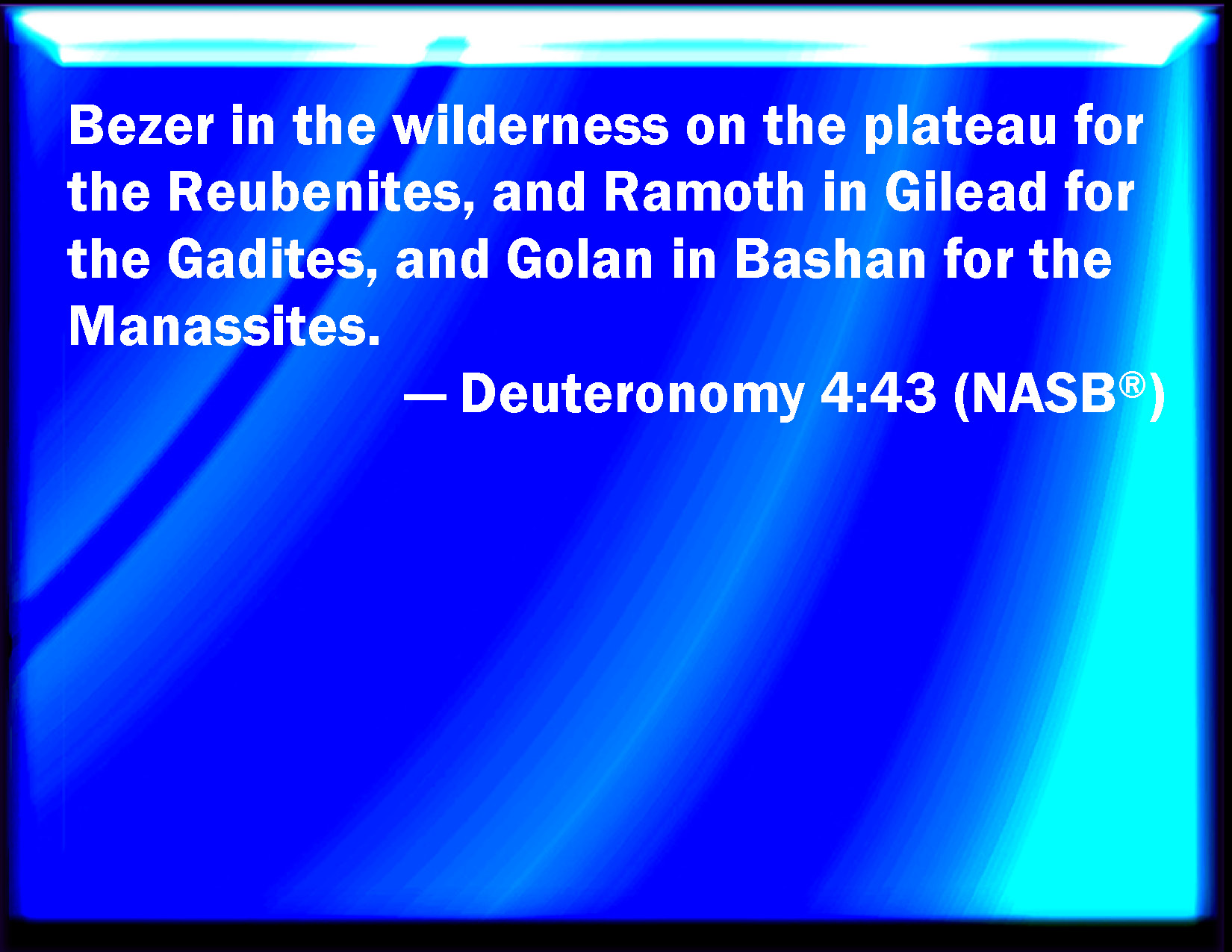 Bible Verse Slide Deuteronomy 4:43 Namely, Bezer in the wilderness, in the plain country, of the Reubenites; and Ramoth in Gilead, of the Gadites; and Golan in Bashan, of the Manassites. KJV: Namely, Bezer in the wilderness, in the plain country, of the Reubenites; and Ramoth in Gilead, of the Gadites; and Golan in Bashan, of the Manassites. DRB: Bosor in the wilderness, which is situate in the plains of the tribe of Ruben: and Ramoth in Galaad, which is in the tribe of Gad: and Golan in Basan, which is in the tribe of Manasses. DBT: Bezer in the wilderness, in the plateau, of the Reubenites, and Ramoth in Gilead, of the Gadites, and Golan in Bashan, of the Manassites. ERV: namely, Bezer in the wilderness, in the plain country, for the Reubenites; and Ramoth in Gilead, for the Gadites; and Golan in Bashan, for the Manassites. WBT: Namely, Bezer in the wilderness, in the plain country, of the Reubenites; and Ramoth in Gilead, of the Gadites; and Golan in Bashan, of the Manassites. WEB: [namely], Bezer in the wilderness, in the plain country, for the Reubenites; and Ramoth in Gilead, for the Gadites; and Golan in Bashan, for the Manassites. YLT: Bezer, in the wilderness, in the land of the plain, of the Reubenite; and Ramoth, in Gilead, of the Gadite; and Golan, in Bashan, of the Manassahite.Links Deuteronomy 4:43 NIV • Deuteronomy 4:43 NLT • Deuteronomy 4:43 ESV • Deuteronomy 4:43 NASB • Deuteronomy 4:43 KJV • Deuteronomy 4:43 Interlinear • Deuteronomy 4:43 Commentaries • Deuteronomy 4:43 Parallel Texts • Deuteronomy 4:43 Bible Apps • Deuteronomy 4:43 Parallel • Bible Hub |