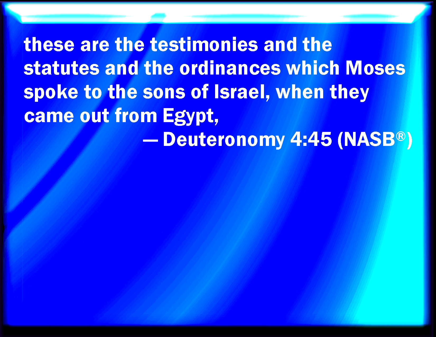 Bible Verse Slide Deuteronomy 4:45 These are the testimonies, and the statutes, and the judgments, which Moses spoke to the children of Israel, after they came forth out of Egypt. KJV: These are the testimonies, and the statutes, and the judgments, which Moses spake unto the children of Israel, after they came forth out of Egypt, DRB: And these are the testimonies and ceremonies and judgments, which he spoke to the children of Israel, when they came out of Egypt, DBT: these are the testimonies, and the statutes, and the ordinances that Moses declared to the children of Israel, when they came out of Egypt, ERV: these are the testimonies, and the statutes, and the judgments, which Moses spake unto the children of Israel, when they came forth out of Egypt; WBT: These are the testimonies, and the statutes, and the judgments, which Moses spoke to the children of Israel, after they came forth from Egypt, WEB: these are the testimonies, and the statutes, and the ordinances, which Moses spoke to the children of Israel, when they came forth out of Egypt, YLT: these are the testimonies, and the statutes, and the judgments, which Moses hath spoken unto the sons of Israel, in their coming out of Egypt,Links Deuteronomy 4:45 NIV • Deuteronomy 4:45 NLT • Deuteronomy 4:45 ESV • Deuteronomy 4:45 NASB • Deuteronomy 4:45 KJV • Deuteronomy 4:45 Interlinear • Deuteronomy 4:45 Commentaries • Deuteronomy 4:45 Parallel Texts • Deuteronomy 4:45 Bible Apps • Deuteronomy 4:45 Parallel • Bible Hub |