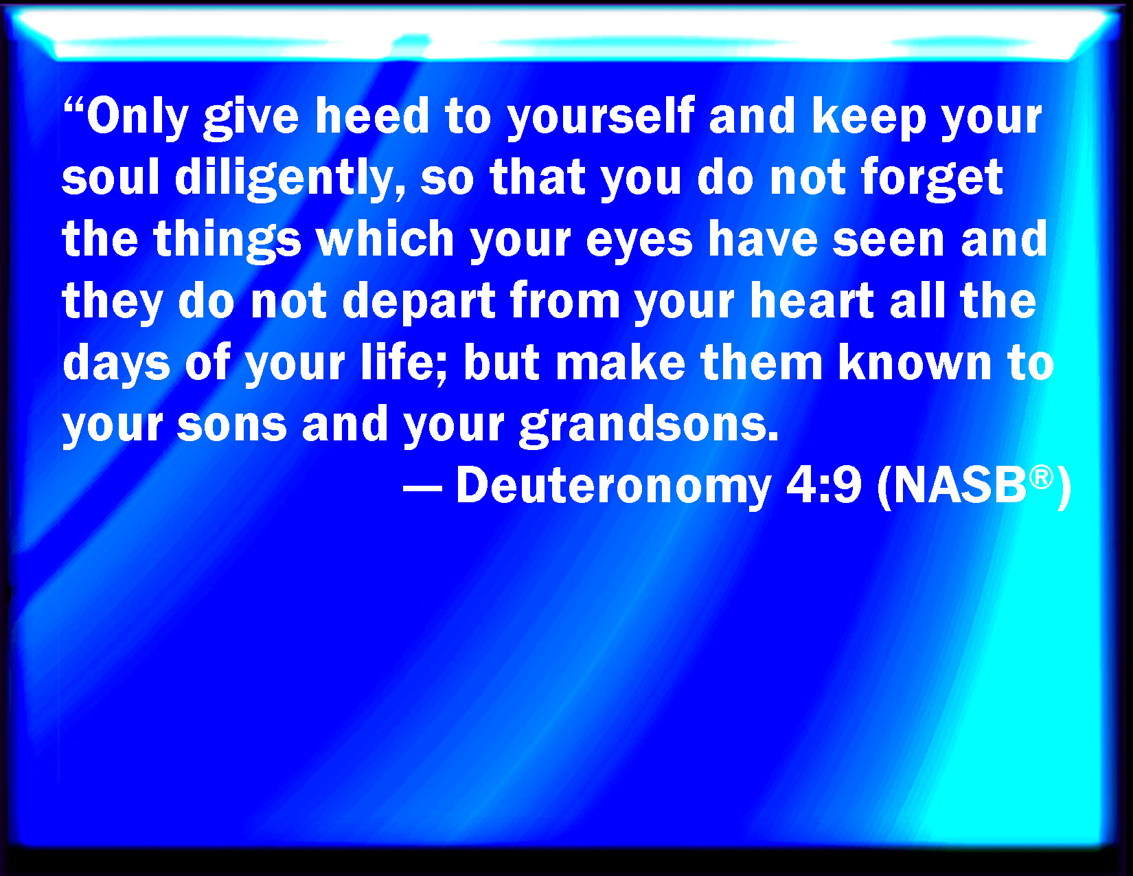 Bible Verse Slide Deuteronomy 4:9 Only take heed to yourself, and keep your soul diligently, lest you forget the things which your eyes have seen, and lest they depart from your heart all the days of your life: but teach them your sons, and your sons' sons; KJV: Only take heed to thyself, and keep thy soul diligently, lest thou forget the things which thine eyes have seen, and lest they depart from thy heart all the days of thy life: but teach them thy sons, and thy sons' sons; DRB: Keep thyself therefore, and thy soul carefully. Forget not the words that thy eyes have seen, and let them not go out of thy heart all the days of thy life. Thou shalt teach them to thy sons and to thy grandsons, DBT: Only take heed to thyself, and keep thy soul diligently, lest thou forget the things that thine eyes have seen (and lest they depart from thy heart all the days of thy life; but thou shalt make them known to thy sons and to thy sons' sons), ERV: Only take heed to thyself, and keep thy soul diligently, lest thou forget the things which thine eyes saw, and lest they depart from thy heart all the days of thy life; but make them known unto thy children and thy children's children; WBT: Only take heed to thyself, and keep thy soul diligently, lest thou shouldst forget the things which thy eyes have seen, and lest they depart from thy heart all the days of thy life: but teach them to thy sons, and thy sons' sons: WEB: Only take heed to yourself, and keep your soul diligently, lest you forget the things which your eyes saw, and lest they depart from your heart all the days of your life; but make them known to your children and your children's children; YLT: 'Only, take heed to thyself, and watch thy soul exceedingly, lest thou forget the things which thine eyes have seen, and lest they turn aside from thy heart, all days of thy life; and thou hast made them known to thy sons, and to thy sons' sons.Links Deuteronomy 4:9 NIV • Deuteronomy 4:9 NLT • Deuteronomy 4:9 ESV • Deuteronomy 4:9 NASB • Deuteronomy 4:9 KJV • Deuteronomy 4:9 Interlinear • Deuteronomy 4:9 Commentaries • Deuteronomy 4:9 Parallel Texts • Deuteronomy 4:9 Bible Apps • Deuteronomy 4:9 Parallel • Bible Hub |