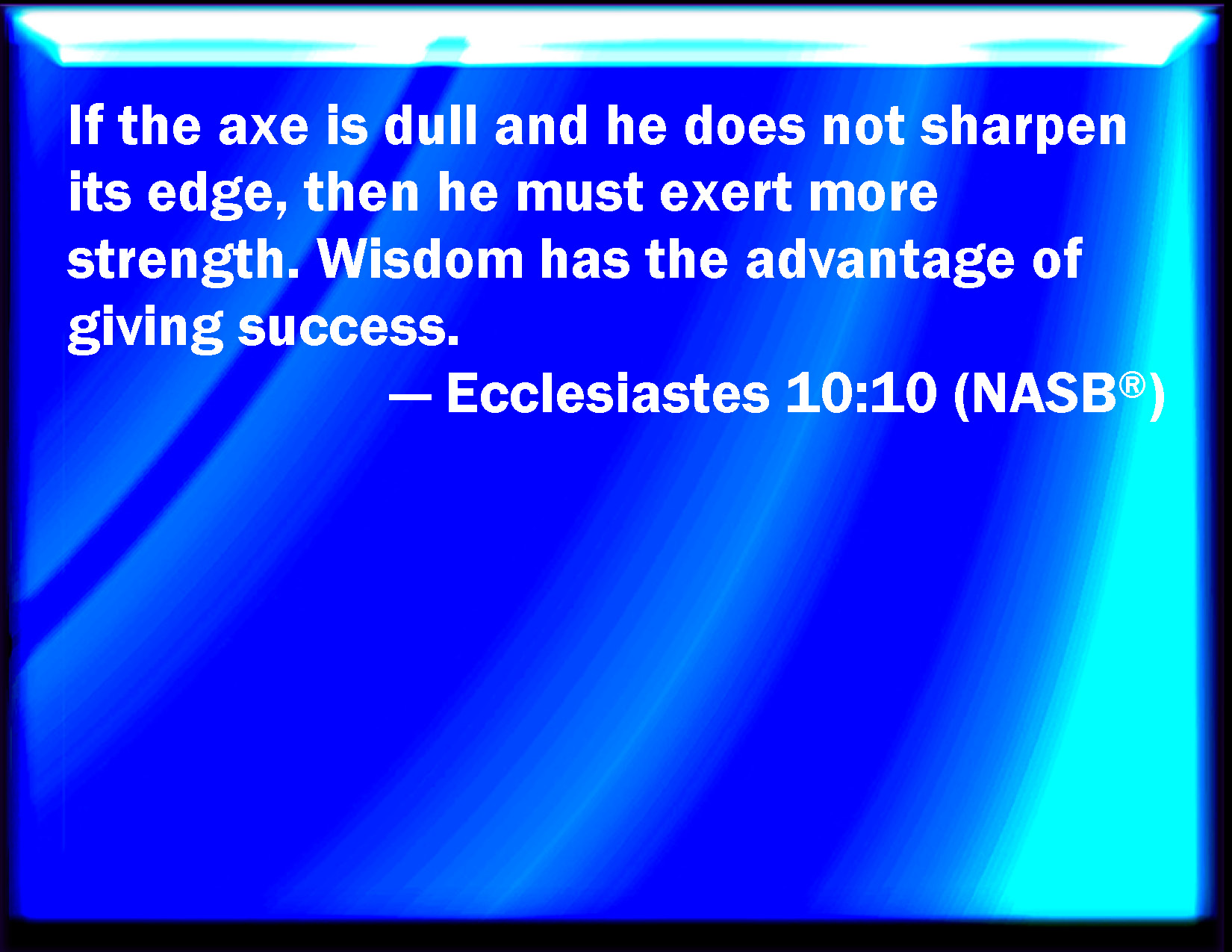 Bible Verse Slide Ecclesiastes 10:10 If the iron be blunt, and he do not whet the edge, then must he put to more strength: but wisdom is profitable to direct. KJV: If the iron be blunt, and he do not whet the edge, then must he put to more strength: but wisdom is profitable to direct. DRB: If the iron be blunt, and be not as before, but be made blunt, with much labour it shall be sharpened: and after industry shall follow wisdom. DBT: If the iron be blunt, and one do not whet the edge, then must he apply more strength; but wisdom is profitable to give success. ERV: If the iron be blunt, and one do not whet the edge, then must he put to more strength: but wisdom is profitable to direct. WBT: If the iron is blunt, and he doth not whet the edge, then must he use more strength: but wisdom is profitable to direct. WEB: If the axe is blunt, and one doesn't sharpen the edge, then he must use more strength; but skill brings success. YLT: If the iron hath been blunt, And he the face hath not sharpened, Then doth he increase strength, And wisdom is advantageous to make right.Links Ecclesiastes 10:10 NIV • Ecclesiastes 10:10 NLT • Ecclesiastes 10:10 ESV • Ecclesiastes 10:10 NASB • Ecclesiastes 10:10 KJV • Ecclesiastes 10:10 Interlinear • Ecclesiastes 10:10 Commentaries • Ecclesiastes 10:10 Parallel Texts • Ecclesiastes 10:10 Bible Apps • Ecclesiastes 10:10 Parallel • Bible Hub |