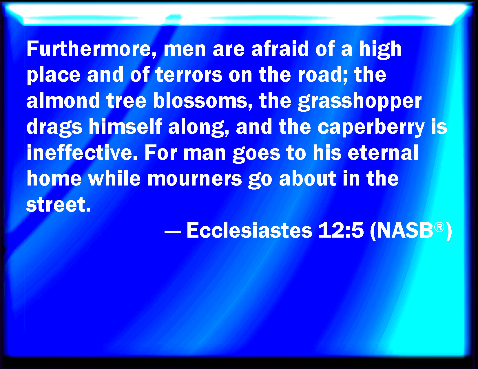 Bible Verse Slide Ecclesiastes 12:5 Also when they shall be afraid of that which is high, and fears shall be in the way, and the almond tree shall flourish, and the grasshopper shall be a burden, and desire shall fail: because man goes to his long home, and the mourners go about the streets: KJV: Also when they shall be afraid of that which is high, and fears shall be in the way, and the almond tree shall flourish, and the grasshopper shall be a burden, and desire shall fail: because man goeth to his long home, and the mourners go about the streets: DRB: And they shall fear high things, and they shall be afraid in the way, the almond tree shall flourish, the locust shall be made fat, and the caper tree shall be destroyed: because man shall go into the house of his eternity, and the mourners shall go round about in the street. DBT: they are also afraid of what is high, and terrors are in the way, and the almond is despised, and the grasshopper is a burden, and the caper-berry is without effect; (for man goeth to his age-long home, and the mourners go about the streets;) ERV: yea, they shall be afraid of that which is high, and terrors shall be in the way; and the almond tree shall blossom, and the grasshopper shall be a burden, and the caper-berry shall fail: because man goeth to his long home, and the mourners go about the streets: WBT: Also when they shall be afraid of that which is high, and fears shall be in the way, and the almond tree shall flourish, and the grasshopper shall be a burden, and desire shall fail: because man goeth to his long home, and the mourners go about the streets: WEB: yes, they shall be afraid of heights, and terrors will be in the way; and the almond tree shall blossom, and the grasshopper shall be a burden, and desire shall fail; because man goes to his everlasting home, and the mourners go about the streets: YLT: Also of that which is high they are afraid, And of the low places in the way, And the almond-tree is despised, And the grasshopper is become a burden, And want is increased, For man is going unto his home age-during, And the mourners have gone round through the street.Links Ecclesiastes 12:5 NIV • Ecclesiastes 12:5 NLT • Ecclesiastes 12:5 ESV • Ecclesiastes 12:5 NASB • Ecclesiastes 12:5 KJV • Ecclesiastes 12:5 Interlinear • Ecclesiastes 12:5 Commentaries • Ecclesiastes 12:5 Parallel Texts • Ecclesiastes 12:5 Bible Apps • Ecclesiastes 12:5 Parallel • Bible Hub |