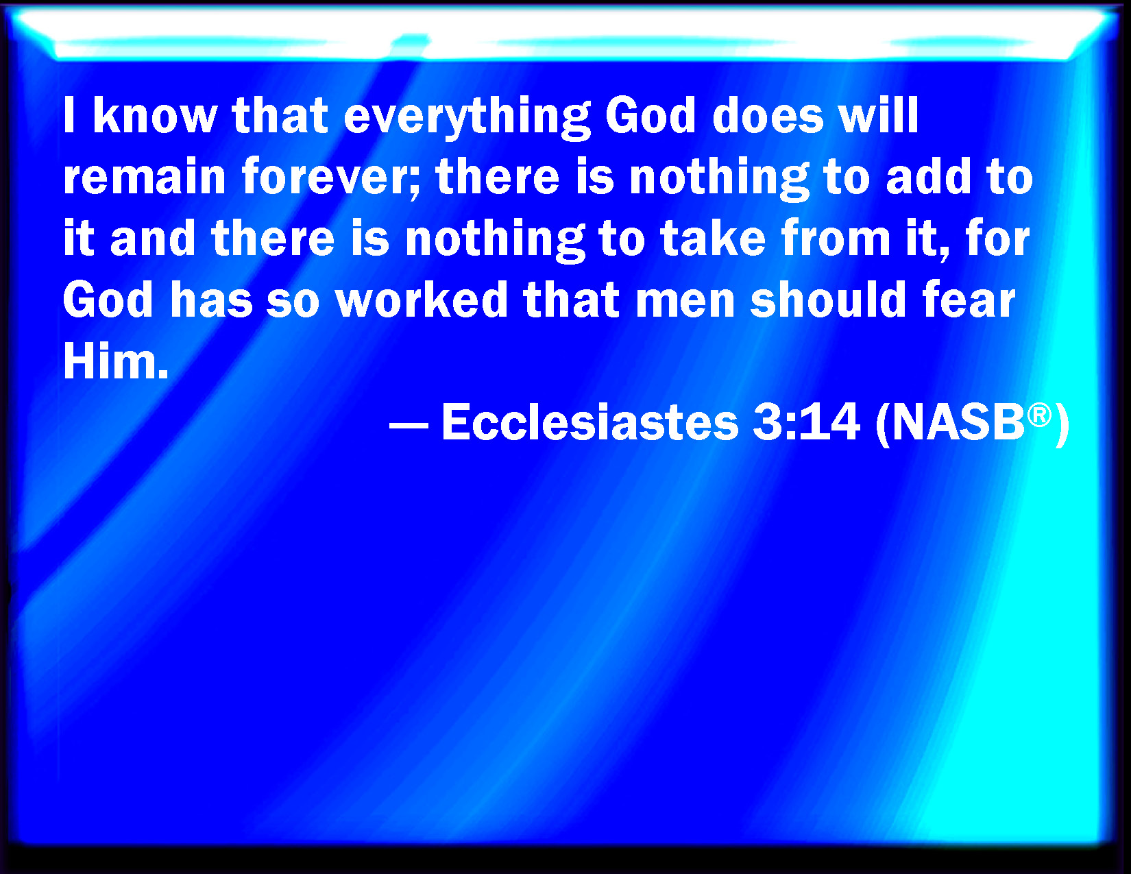 Bible Verse Slide Ecclesiastes 3:14 I know that, whatever God does, it shall be for ever: nothing can be put to it, nor any thing taken from it: and God does it, that men should fear before him. KJV: I know that, whatsoever God doeth, it shall be for ever: nothing can be put to it, nor any thing taken from it: and God doeth it, that men should fear before him. DRB: I have learned that all the works which God hath made, continue for ever: we cannot add any thing, nor take away from those things which God hath made that he may be feared. DBT: I know that whatever God doeth, it shall be for ever; there is nothing to be added to it, nor anything to be taken from it; and God doeth it, that men should fear before him. ERV: I know that, whatsoever God doeth, it shall be for ever: nothing can be put to it, nor any thing taken from it: and God hath done it, that men should fear before him. WBT: I know that, whatever God doeth, it shall be for ever: nothing can be added to it, nor any thing taken from it: and God doeth it, that men should fear before him. WEB: I know that whatever God does, it shall be forever. Nothing can be added to it, nor anything taken from it; and God has done it, that men should fear before him. YLT: I have known that all that God doth is to the age, to it nothing is to be added, and from it nothing is to be withdrawn; and God hath wrought that they do fear before Him.Links Ecclesiastes 3:14 NIV • Ecclesiastes 3:14 NLT • Ecclesiastes 3:14 ESV • Ecclesiastes 3:14 NASB • Ecclesiastes 3:14 KJV • Ecclesiastes 3:14 Interlinear • Ecclesiastes 3:14 Commentaries • Ecclesiastes 3:14 Parallel Texts • Ecclesiastes 3:14 Bible Apps • Ecclesiastes 3:14 Parallel • Bible Hub |