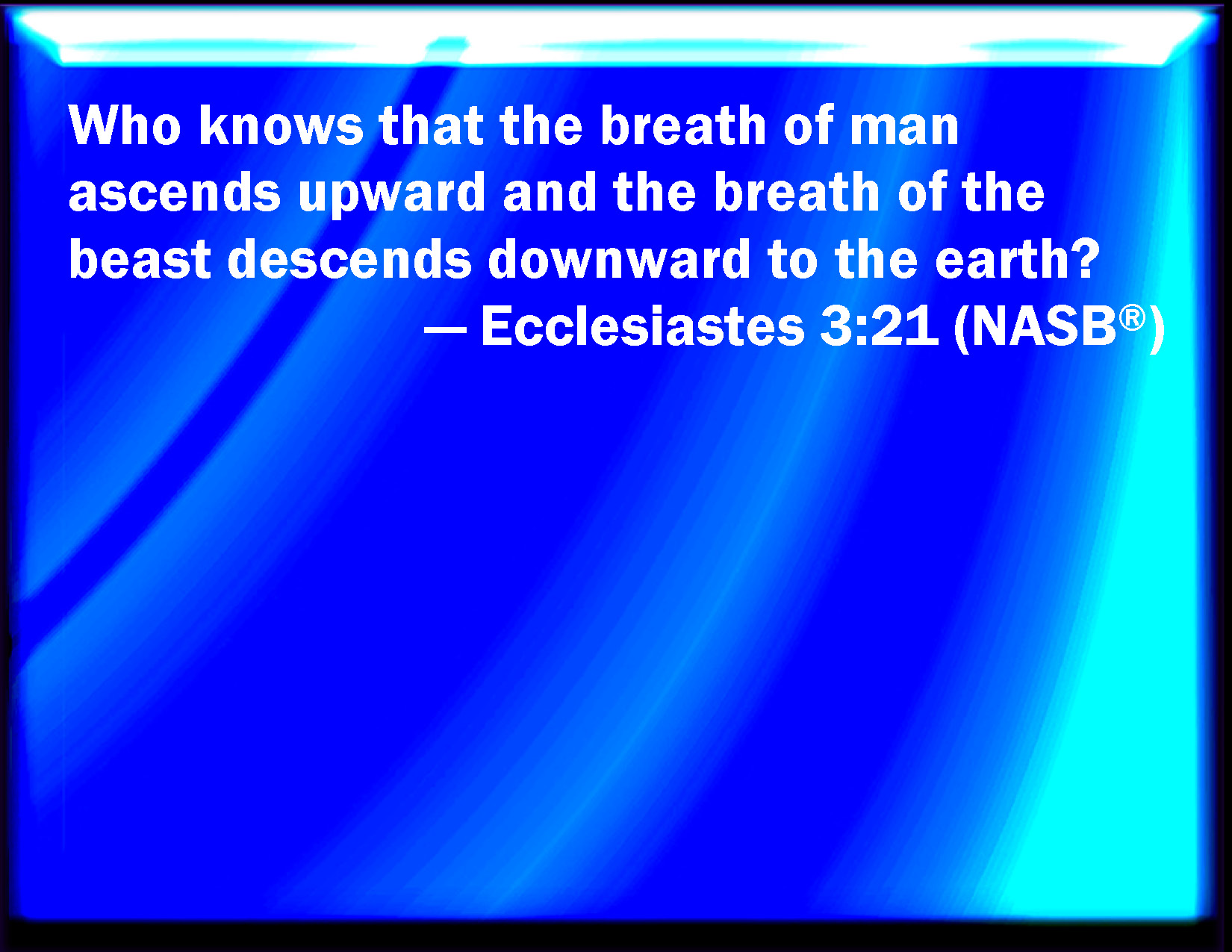 Bible Verse Slide Ecclesiastes 3:21 Who knows the spirit of man that goes upward, and the spirit of the beast that goes downward to the earth? KJV: Who knoweth the spirit of man that goeth upward, and the spirit of the beast that goeth downward to the earth? DRB: Who knoweth if the spirit of the children of Adam ascend upward, and if the spirit of the beasts descend downward? DBT: Who knoweth the spirit of the children of men? Doth it go upwards? and the spirit of the beasts, doth it go downwards to the earth? ERV: Who knoweth the spirit of man whether it goeth upward, and the spirit of the beast whether it goeth downward to the earth? WBT: Who knoweth the spirit of man that goeth upward, and the spirit of the beast that goeth downward to the earth? WEB: Who knows the spirit of man, whether it goes upward, and the spirit of the animal, whether it goes downward to the earth?" YLT: Who knoweth the spirit of the sons of man that is going up on high, and the spirit of the beast that is going down below to the earth?Links Ecclesiastes 3:21 NIV • Ecclesiastes 3:21 NLT • Ecclesiastes 3:21 ESV • Ecclesiastes 3:21 NASB • Ecclesiastes 3:21 KJV • Ecclesiastes 3:21 Interlinear • Ecclesiastes 3:21 Commentaries • Ecclesiastes 3:21 Parallel Texts • Ecclesiastes 3:21 Bible Apps • Ecclesiastes 3:21 Parallel • Bible Hub |